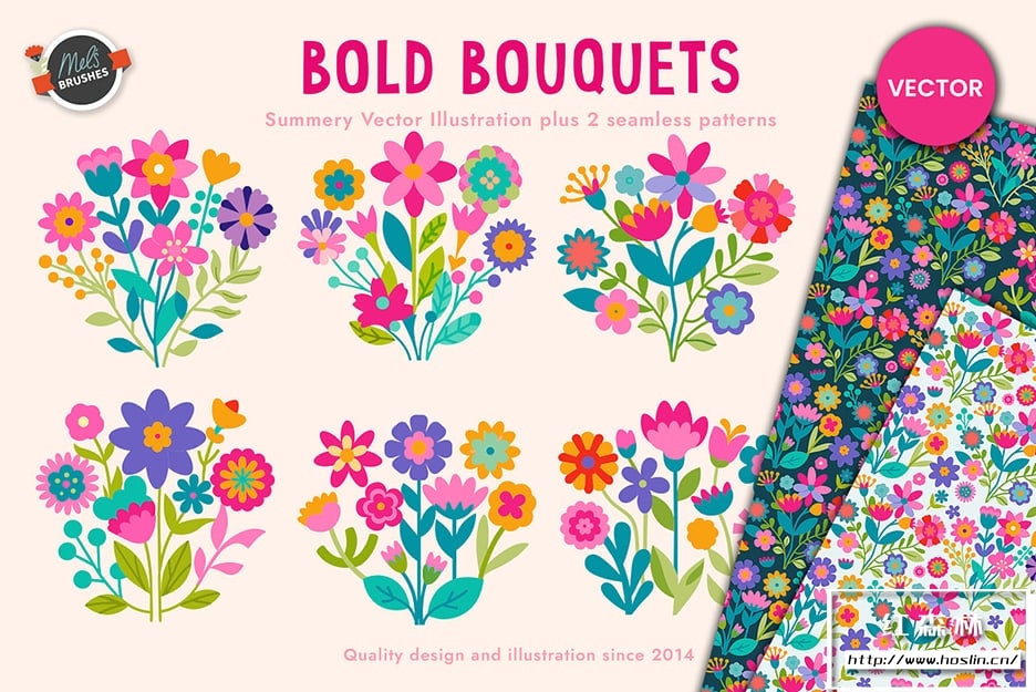 大胆的花束-夏季矢量插图集。使用Bold Bouquets矢量插图集为您的项目增光添彩。此系列以鲜艳的花卉设计为特色,非常适合为任何创意作品增添一丝夏日气息。其中包括六幅色彩缤纷的花束插图和两种无缝图案,确保在个人和商业项目中的多功能性和易用性。