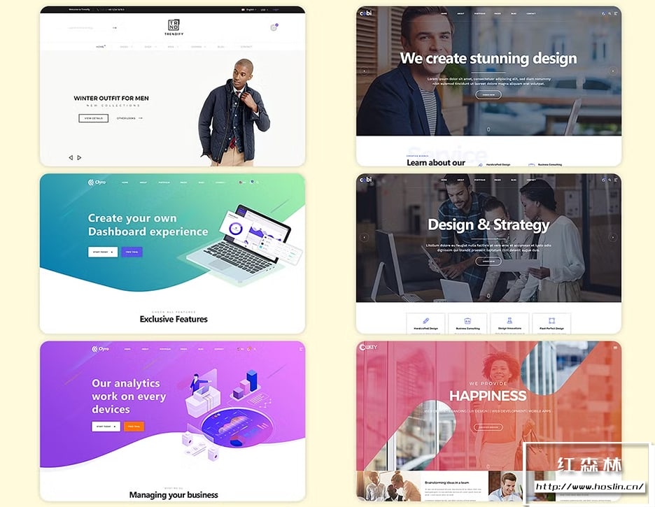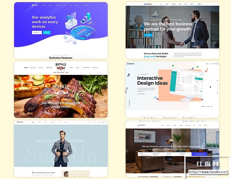 页面和类别:未来主义、有创造力的、机构、文件夹、技术、公司的、移动的、电子商务、教育、房地产、健康与健身、金融、食物和饮料、社交网络、旅行、购物、非营利、零售、博客和新闻、生活方式、照片和视频等。