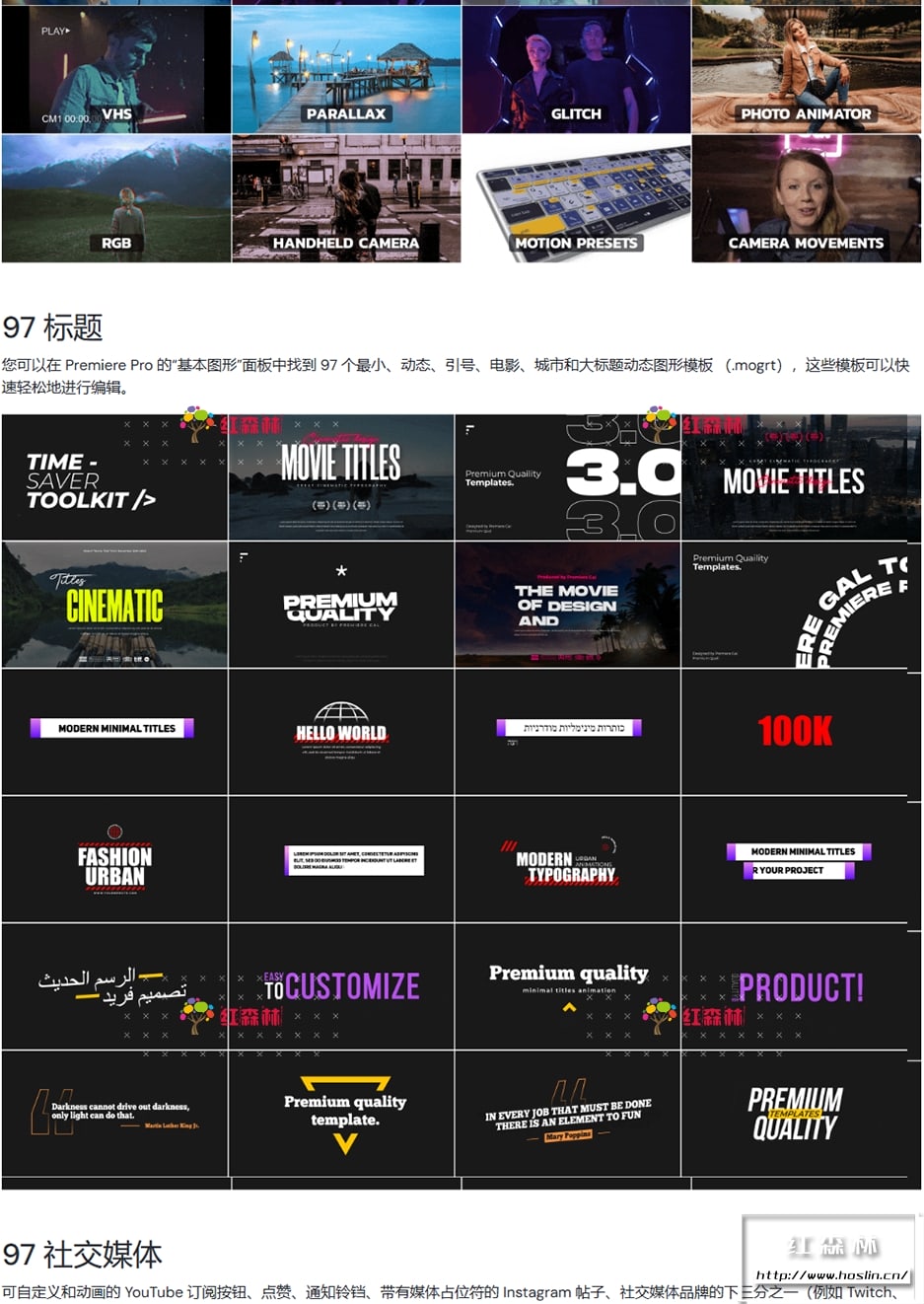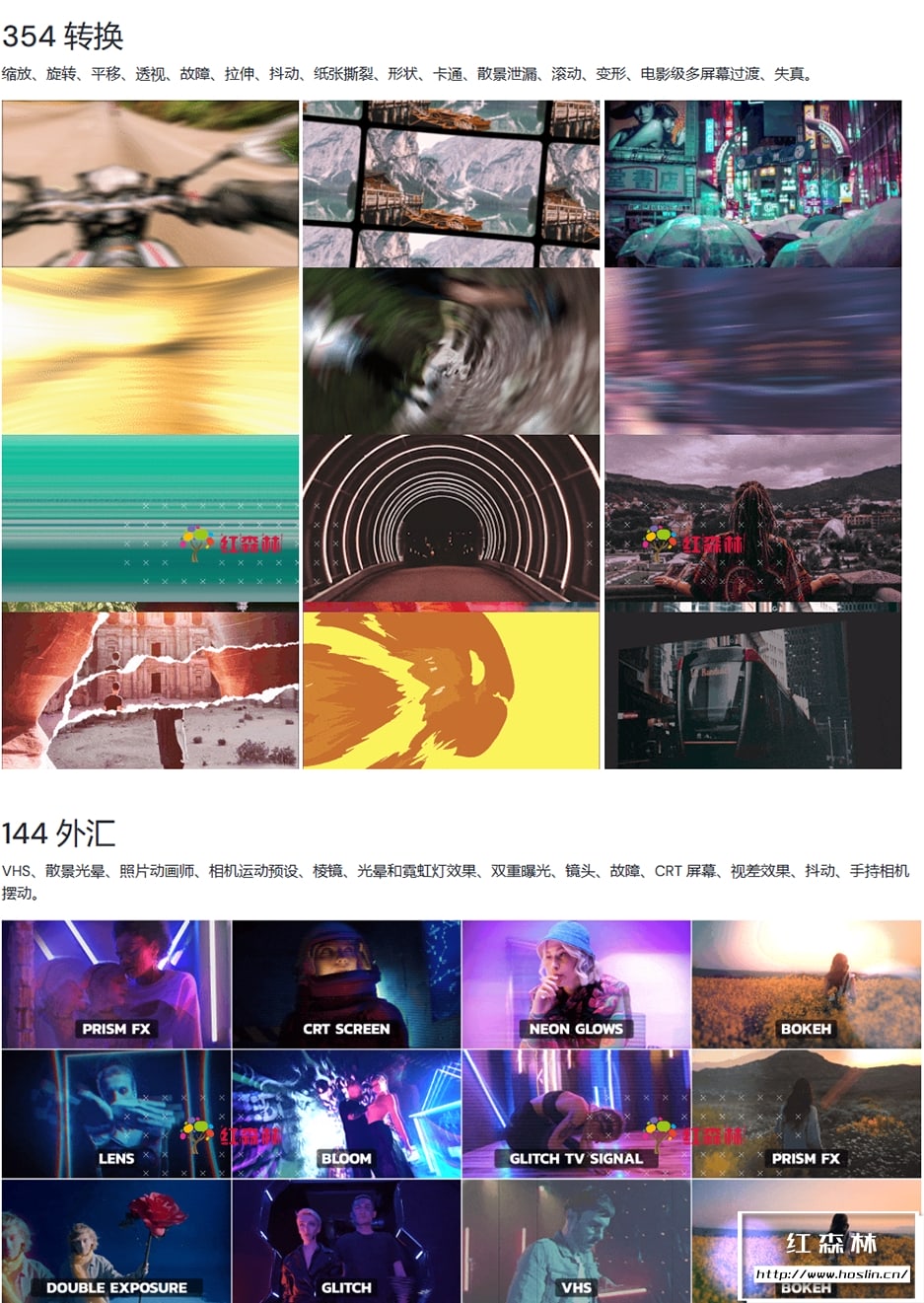 社交媒体 (97)、标题 (97)、下三分之一 (50)、计时器 (16)、界面项 (80)、形状 (90)、排版 (30)、过渡 (354)、文本动画 (65)、颜色分级 (100)、FX (144)、叠加 (57)、分割帧 (70)、徽标显示 (5)、消息 (26)、信息图表 (55)、背景 (51)、声音 FX (131) — 总计超过1,550 FX 触手可及!
