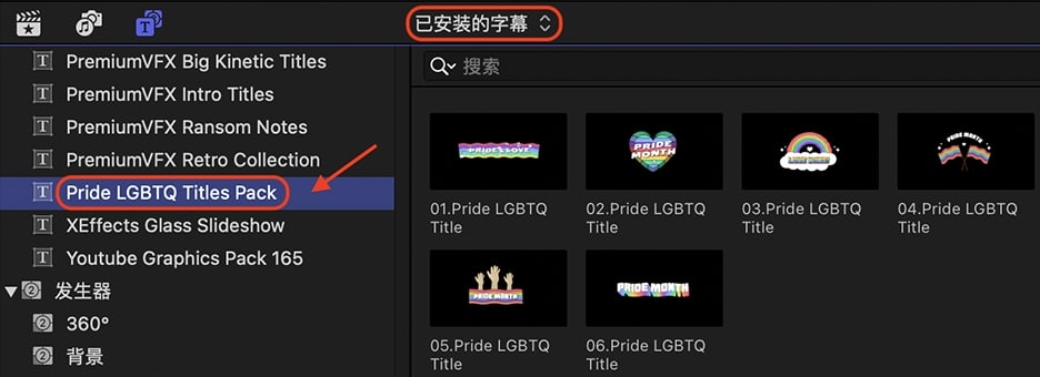 Pride LGBTQ Titles Pack 包含6种与彩虹、LGBTQ+主题相关的贴纸和文字标题动画预设,可以调整文字的颜色、字体、大小、位置等属性。