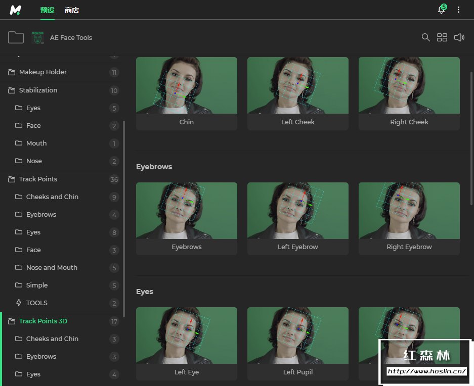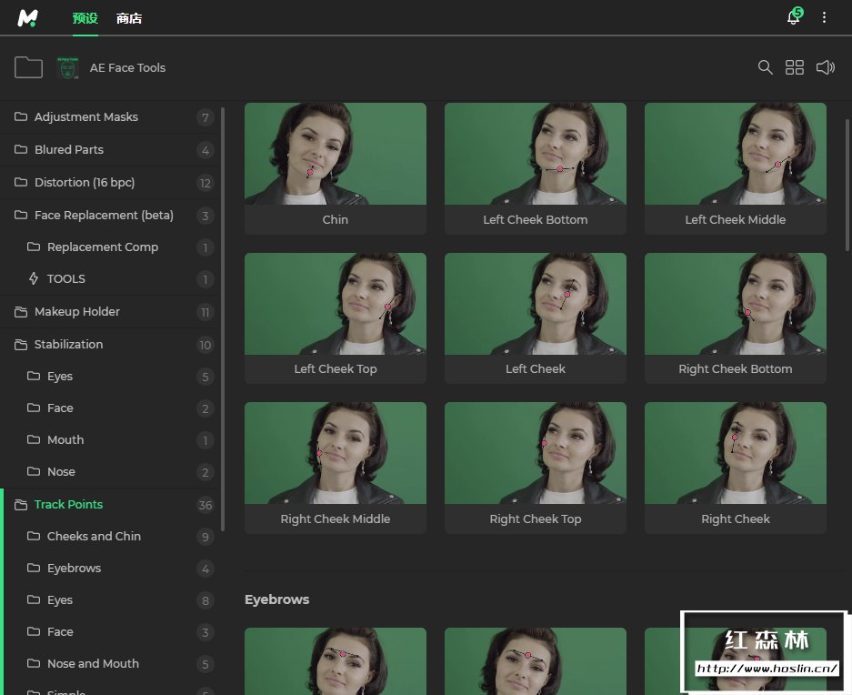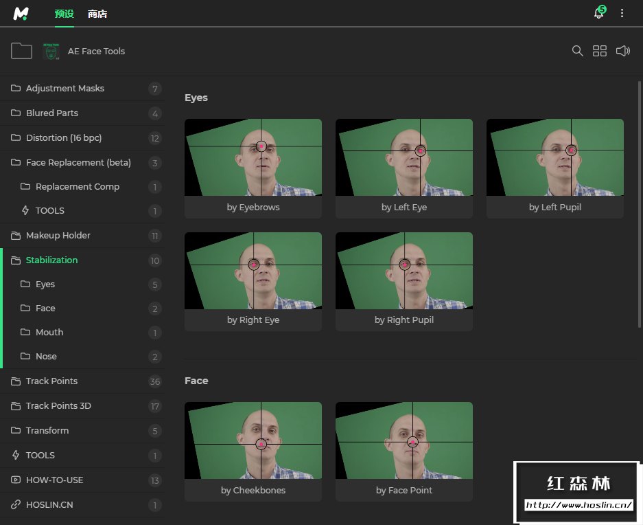 - 对于使用跟踪点的工具,面部的各个部分(眼睛,鼻子,嘴巴)和面部替换–要求After Effects版本不少于CC 2018