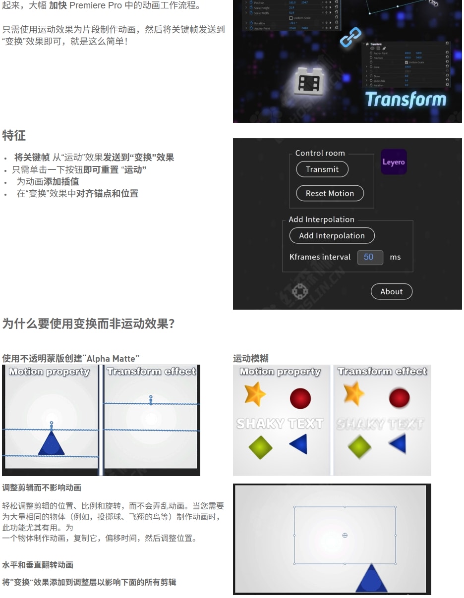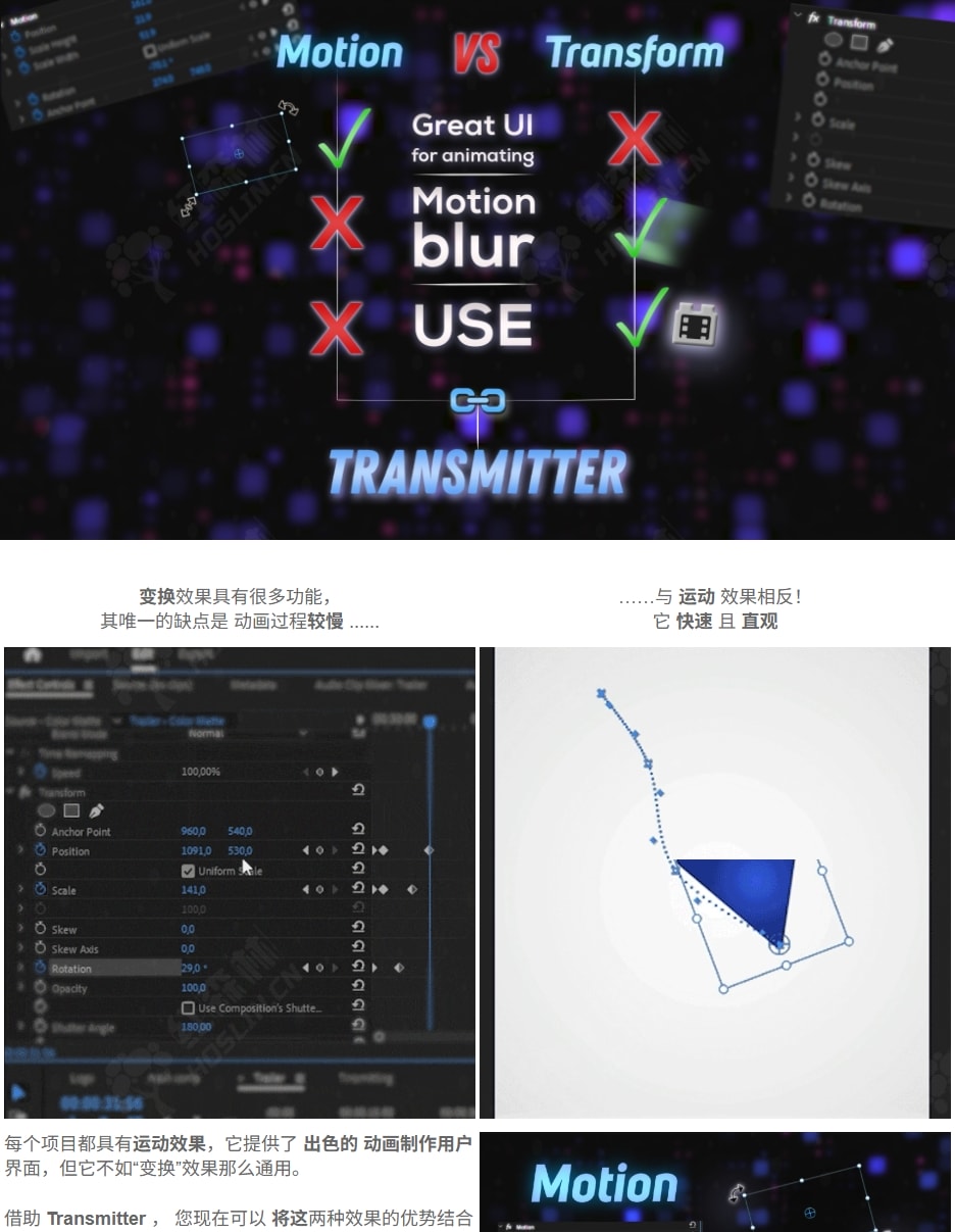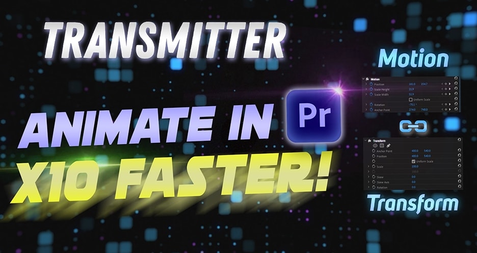 使用脚本 Transmitter 制作动画并使用“变换”效果,速度将快10倍!每个项目都有运动效果,它提供了 出色的动画用户界面,但它不如“变换”效果那么通用。借助Transmitter脚本 ,您现在可以将两种效果的优势结合起来,大大加快 Premiere Pro 中的动画工作流程。只需使用运动效果为剪辑制作动画,然后将关键帧发送到“变换”效果,就这么简单!