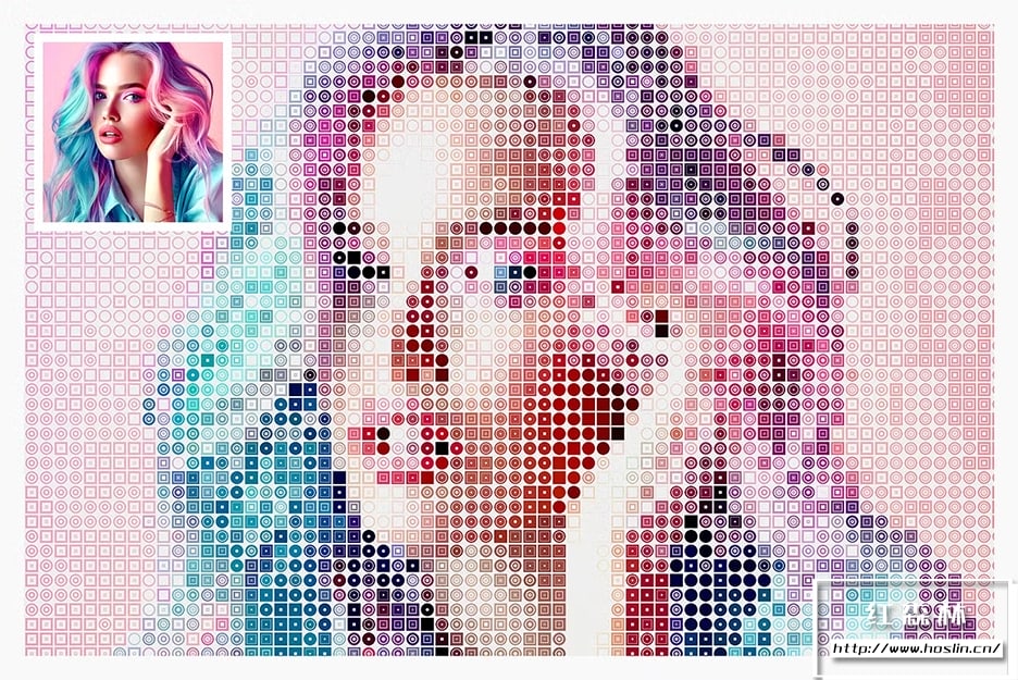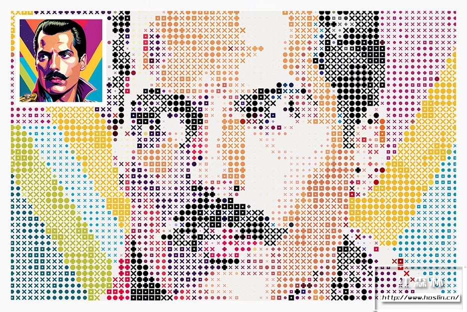 该动作利用各种形状来创建马赛克。这些形状代表原始图像的明亮和黑暗区域。在一种样式中,代表暗区的形状较大,而代表亮区的形状较小。这确保了马赛克中的视觉平衡。通过组合这些形状排列,该动作生成原始图像的马赛克版本。结果在视觉上令人惊叹且引人入胜。