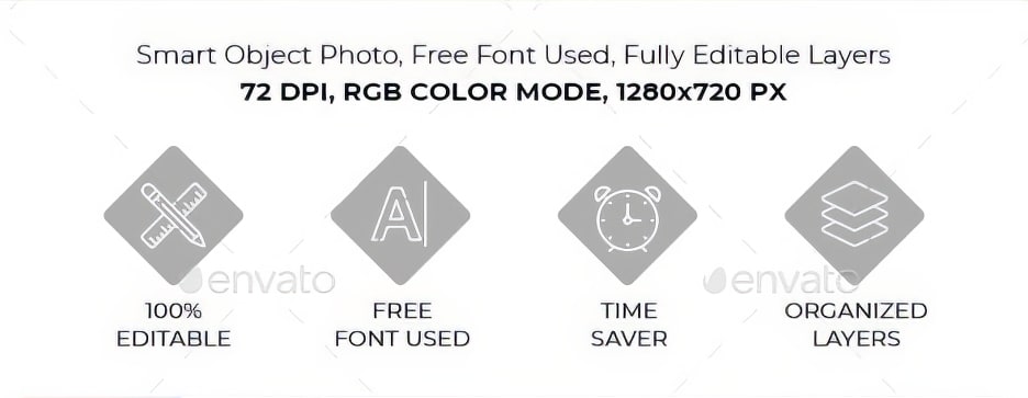 特征:包含 50 个模板 1280×720 像素 50 个完全分层的 PSD 文件 现代与当代设计 100% 可编辑(每个元素位于其自己的图层上) 包含帮助文件