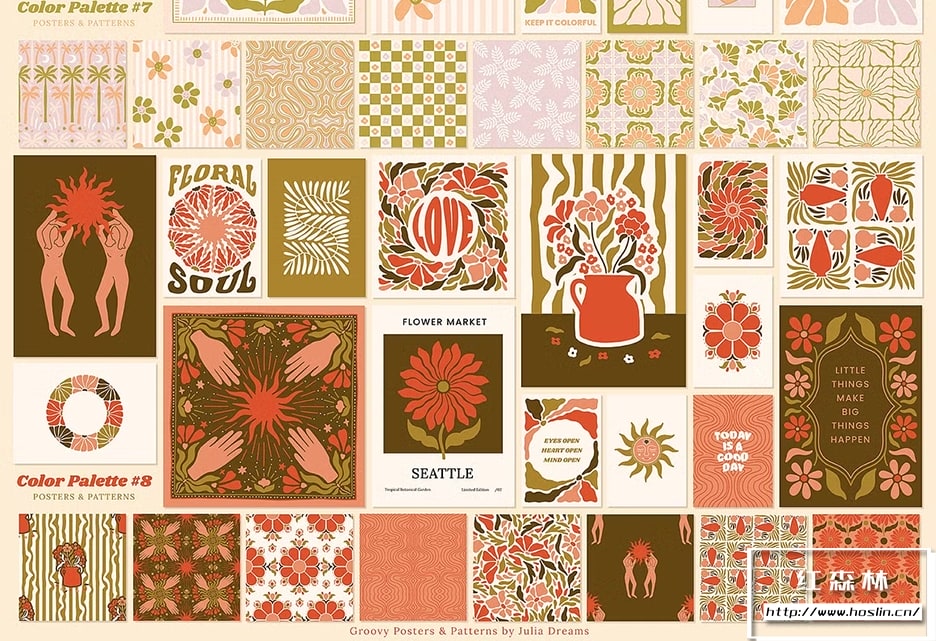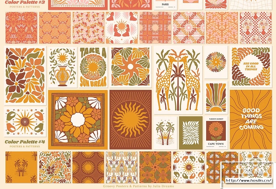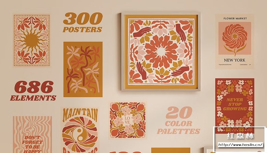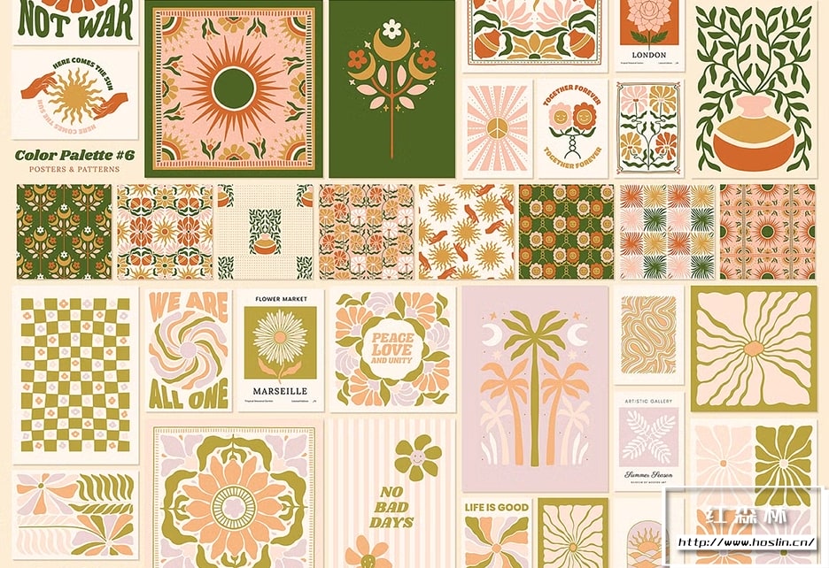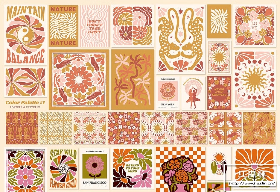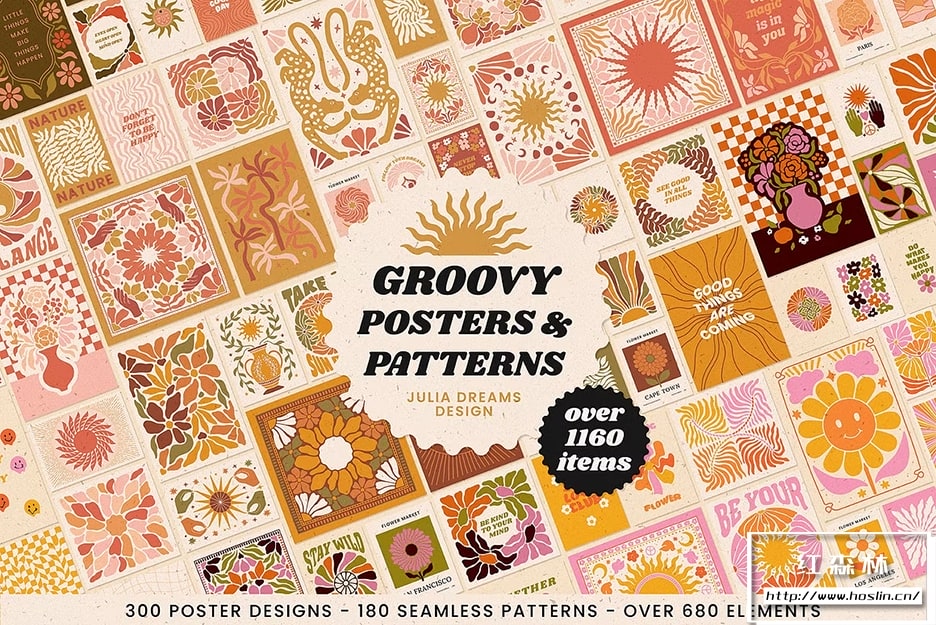 欢迎来到Groovy 海报和图案包- 一个包含 1160 多种图形物品的大型集合,灵感来自 70 年代、复古和自然!很棒的工具包,助您开创自己的事业!该系列制作精良,注重细节。它由不同的预制海报、元素和无缝图案组成,可以单独使用或与其他元素组合使用。