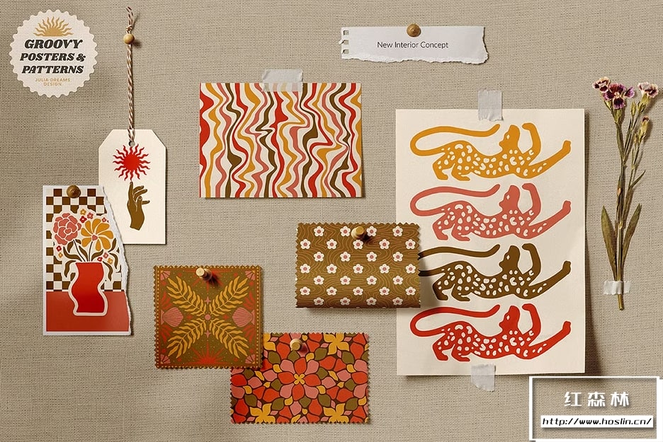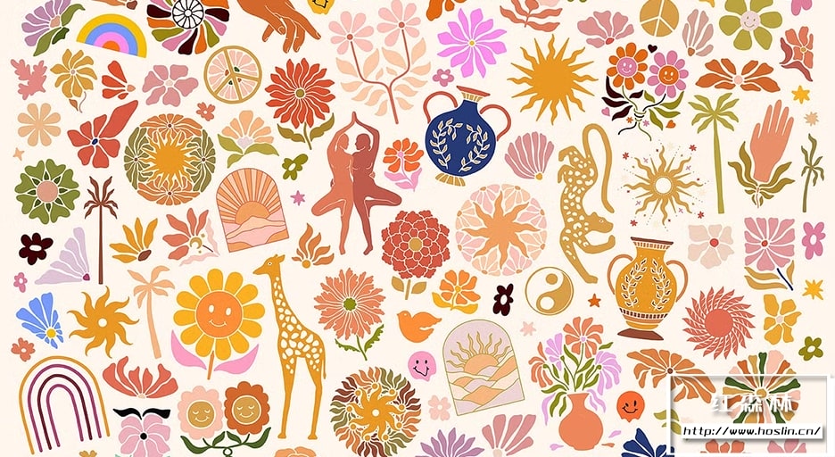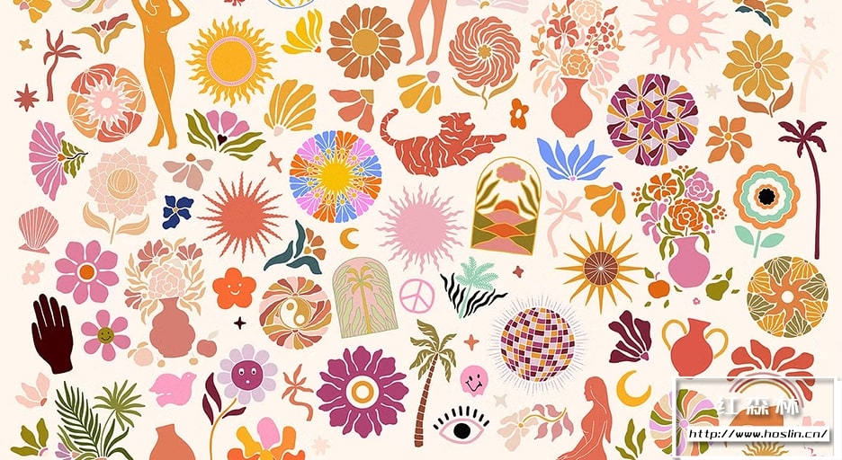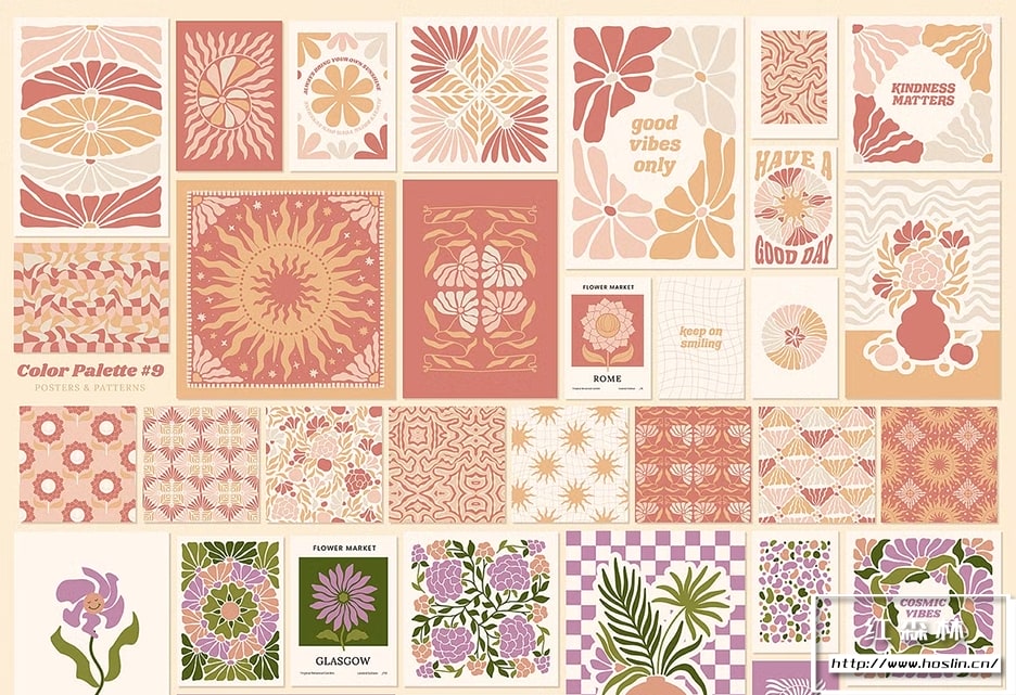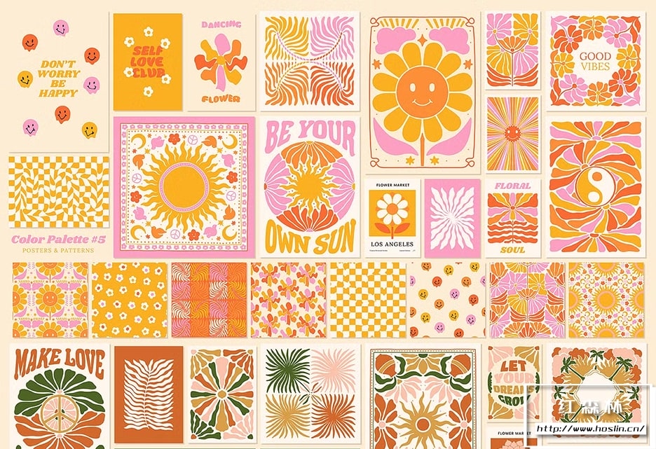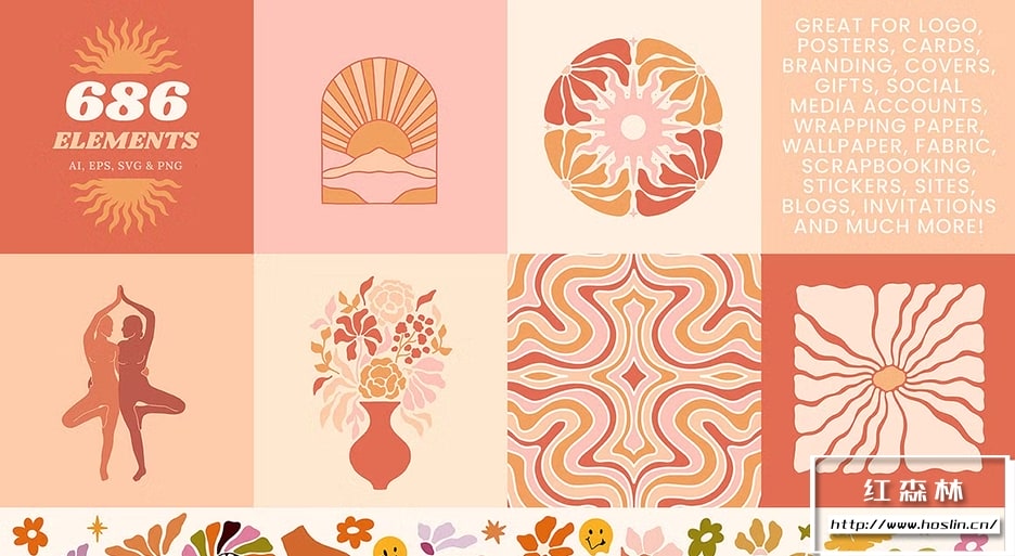 欢迎来到Groovy 海报和图案包- 一个包含 1160 多种图形物品的大型集合,灵感来自 70 年代、复古和自然!很棒的工具包,助您开创自己的事业!该系列制作精良,注重细节。它由不同的预制海报、元素和无缝图案组成,可以单独使用或与其他元素组合使用。