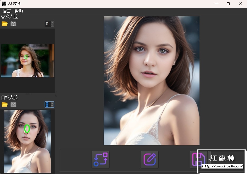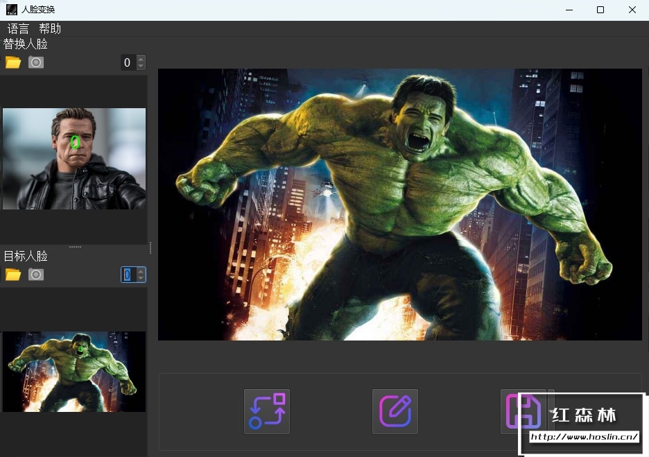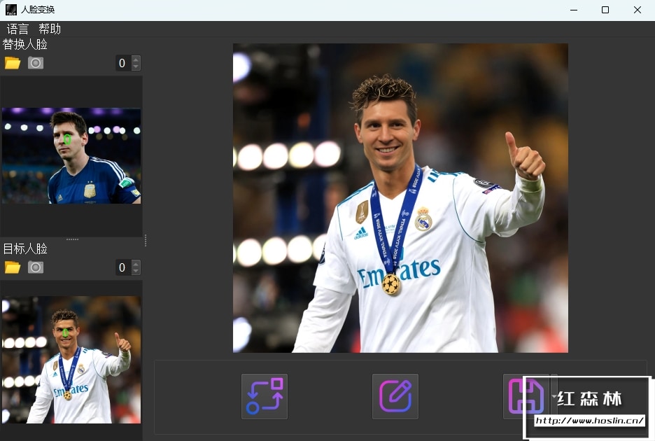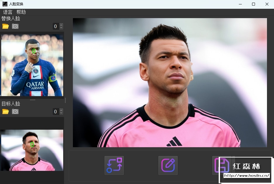 - 同一照片多个脸型更换:软件支持在同一张照片中更换不同指定的脸,您可以通过选项中的 1、2、3 等进行固定选择需要更换的脸部。