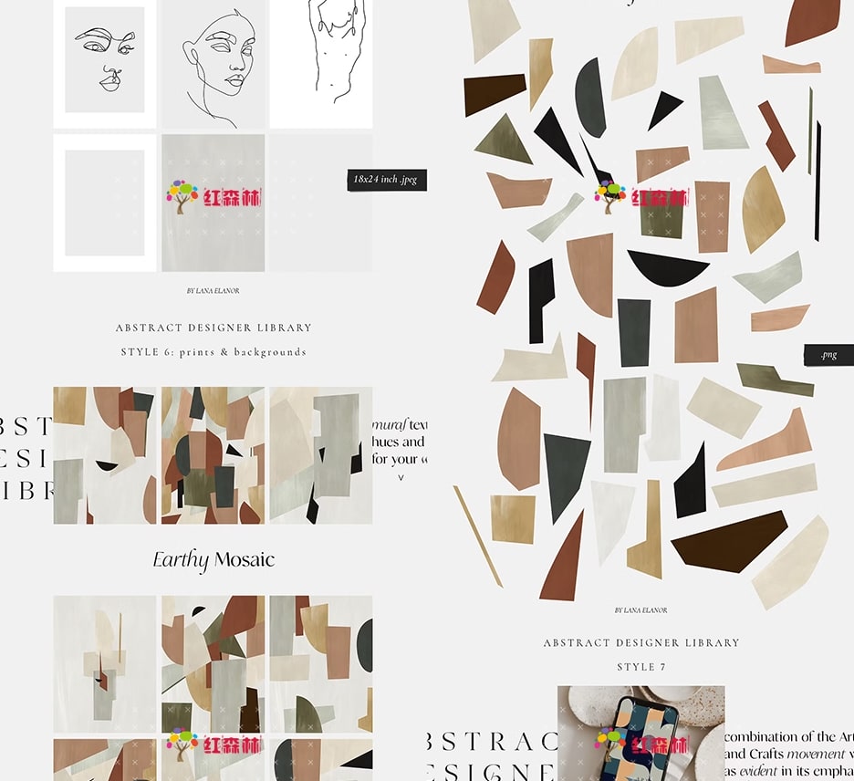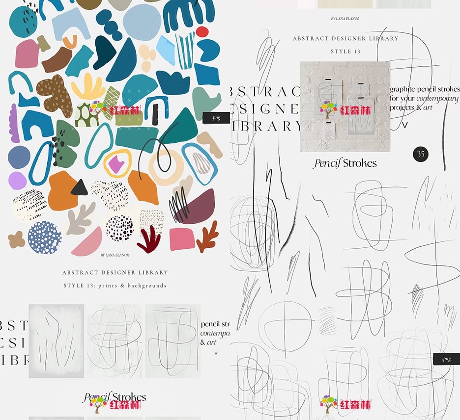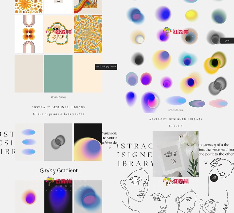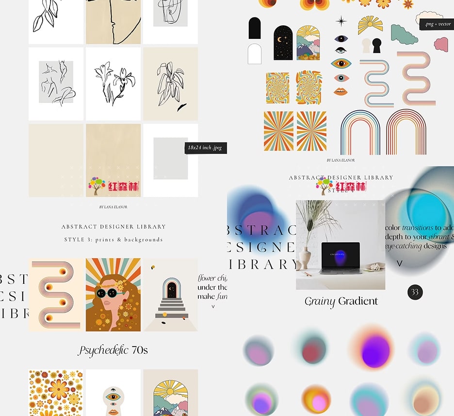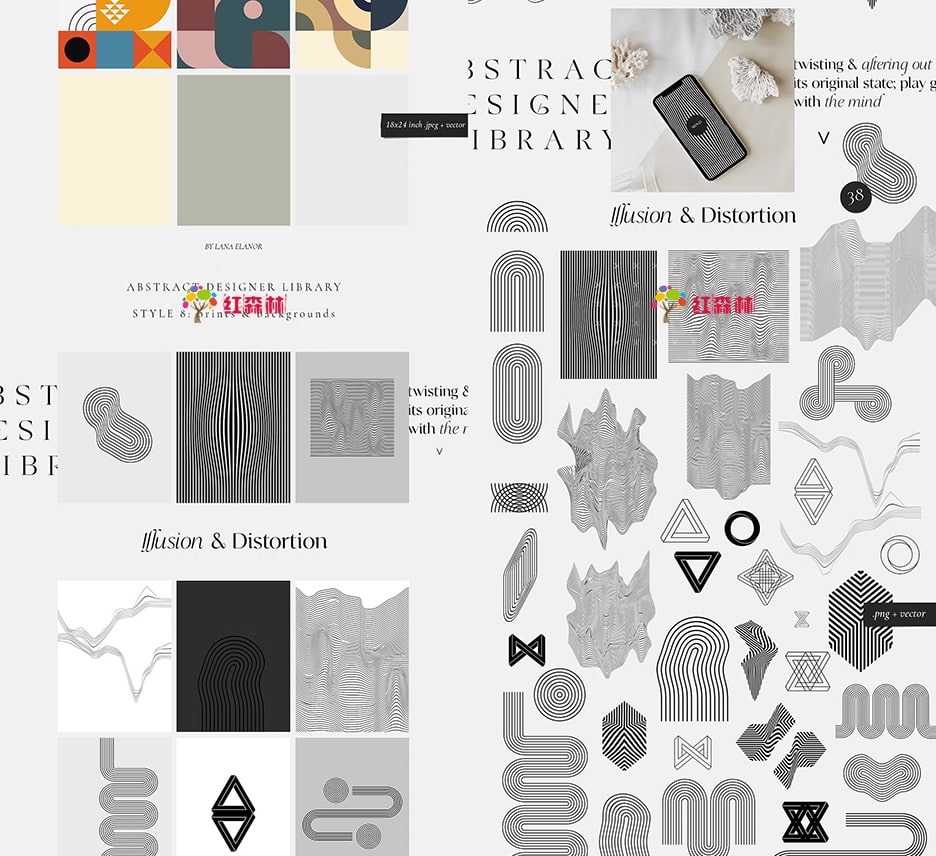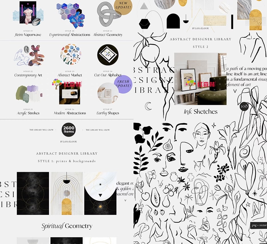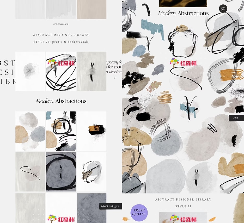 - 26 个现代抽象:58 个元素 (.png) + 12 个印刷品/背景 (.jpg)