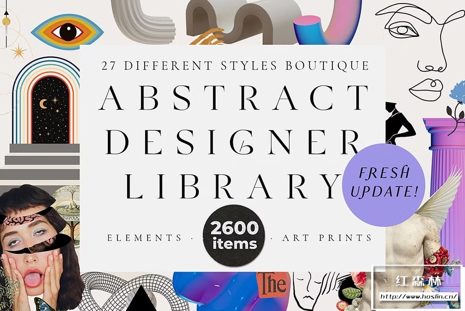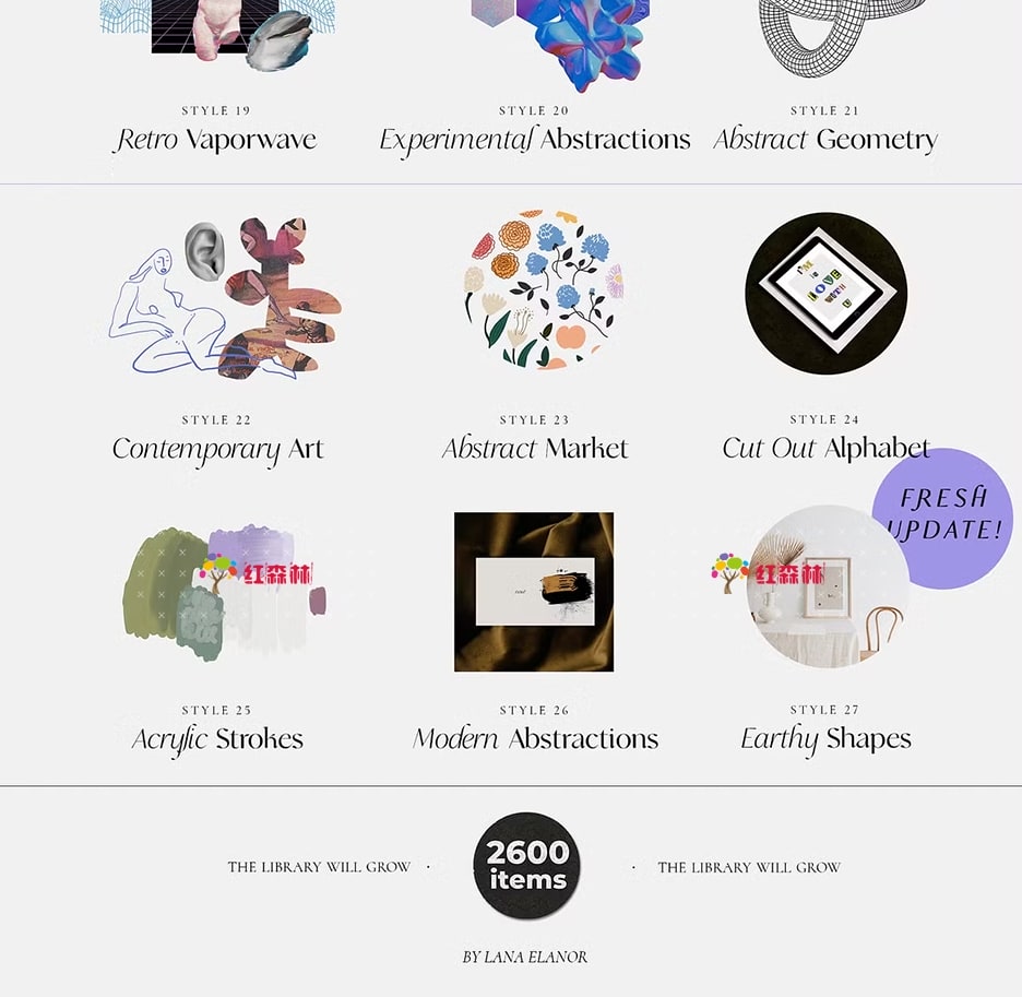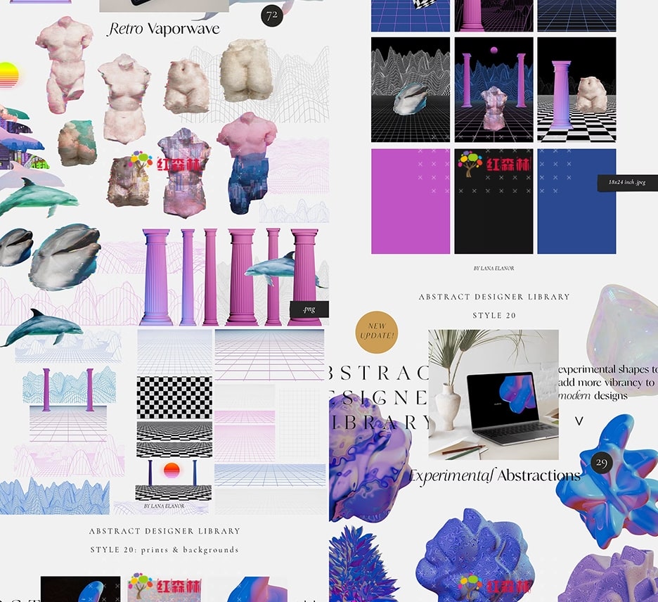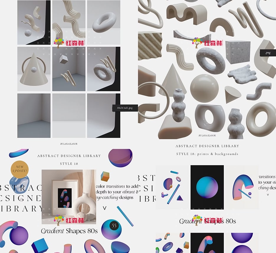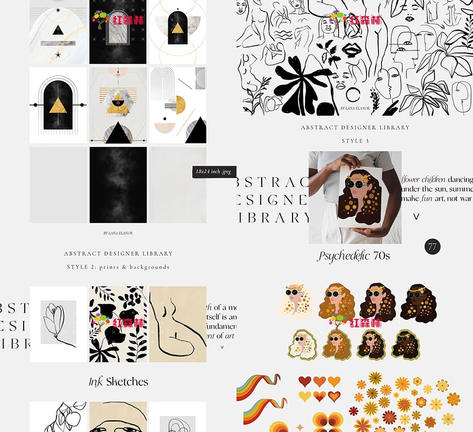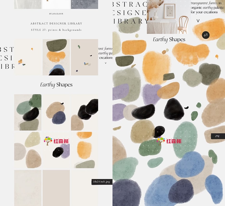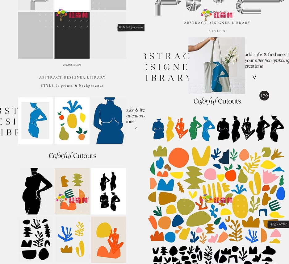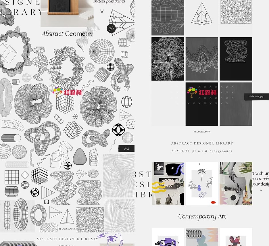 - 26 个现代抽象:58 个元素 (.png) + 12 个印刷品/背景 (.jpg)