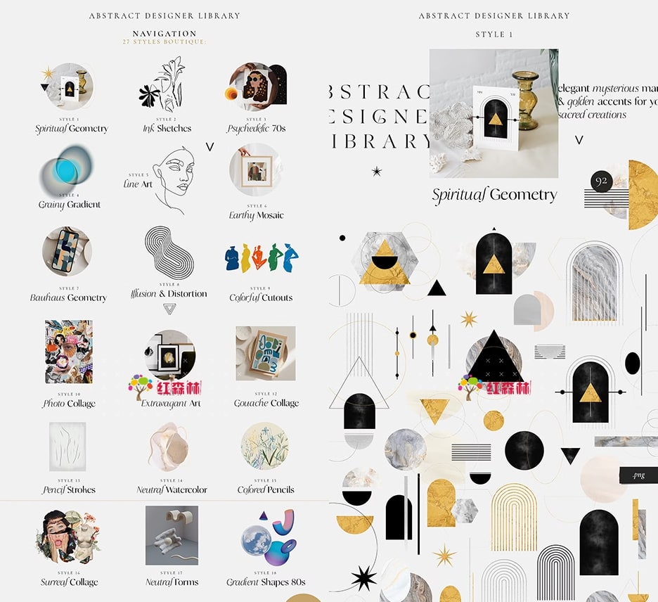 - 01 精神几何:92 个元素(.png)+ 12 个印刷品/背景(.jpg)
