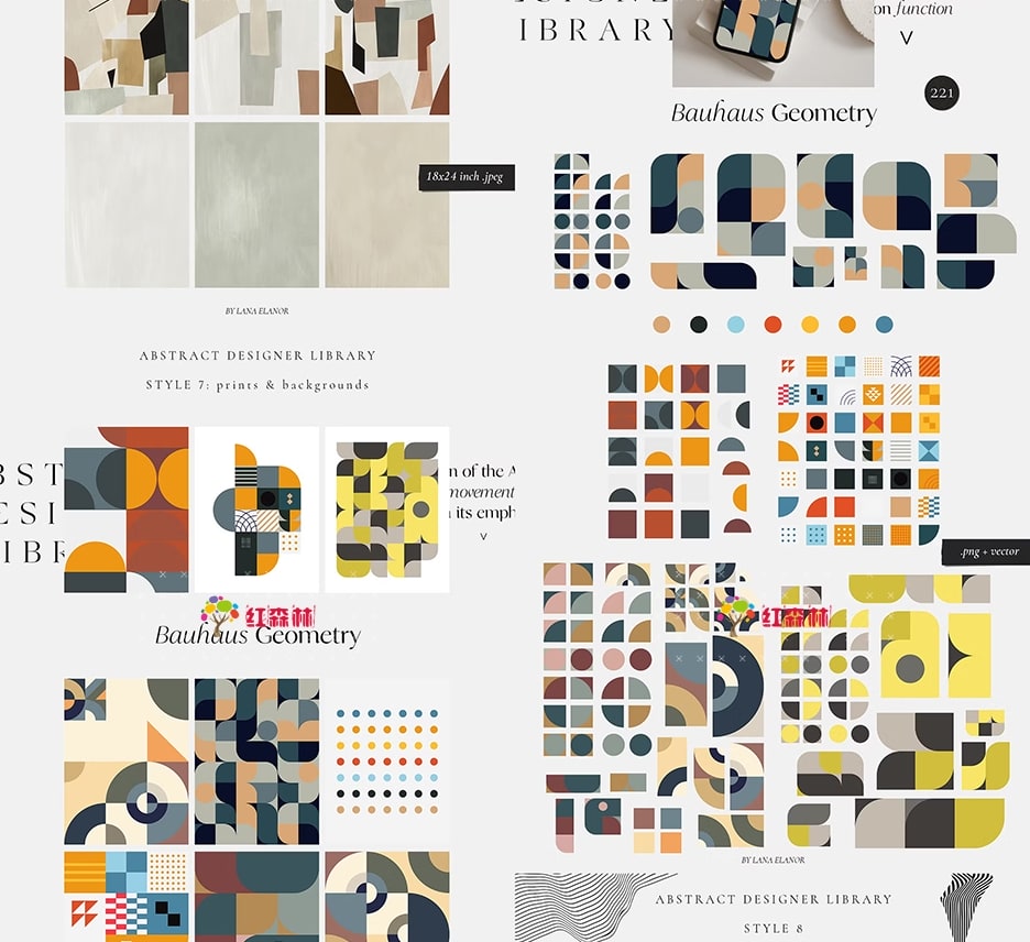 - 07 包豪斯几何:221 个元素(.png+.ai+.eps)+ 12 个印刷品/背景(.jpg+.ai+.eps)