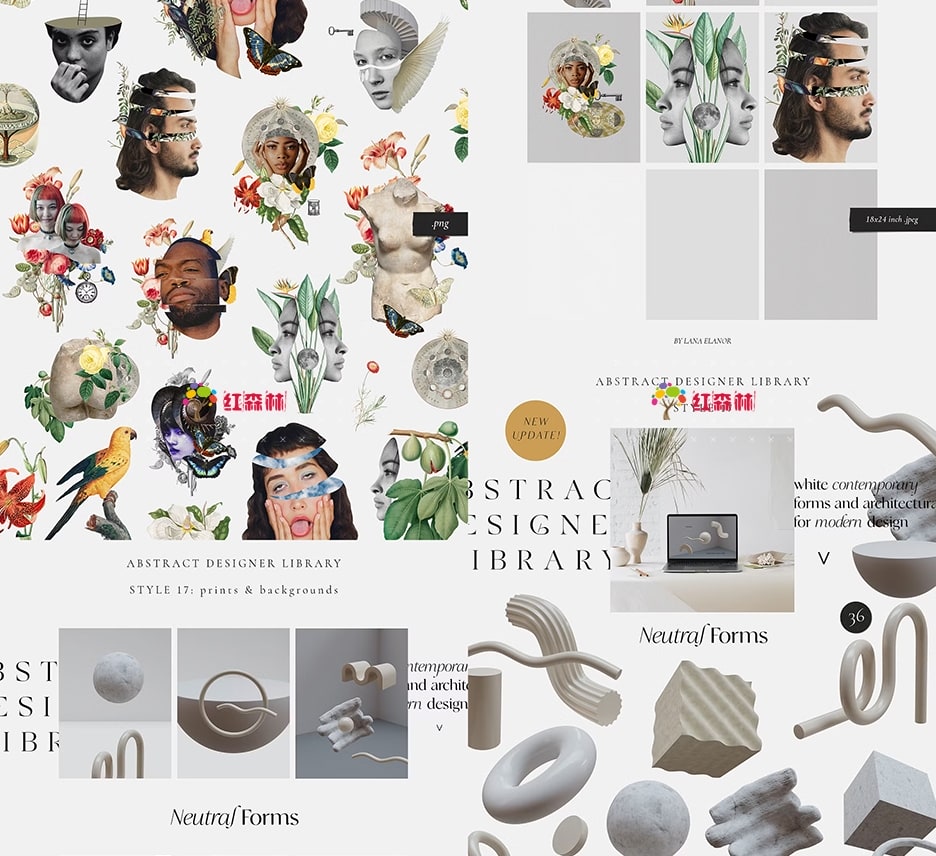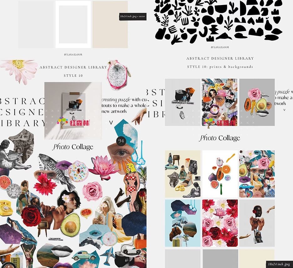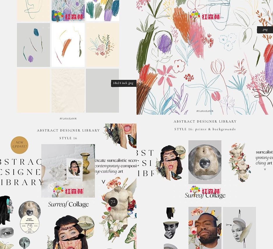 - 16 超现实拼贴画:72 个元素(.png)+ 12 个印刷品/背景(.jpg)