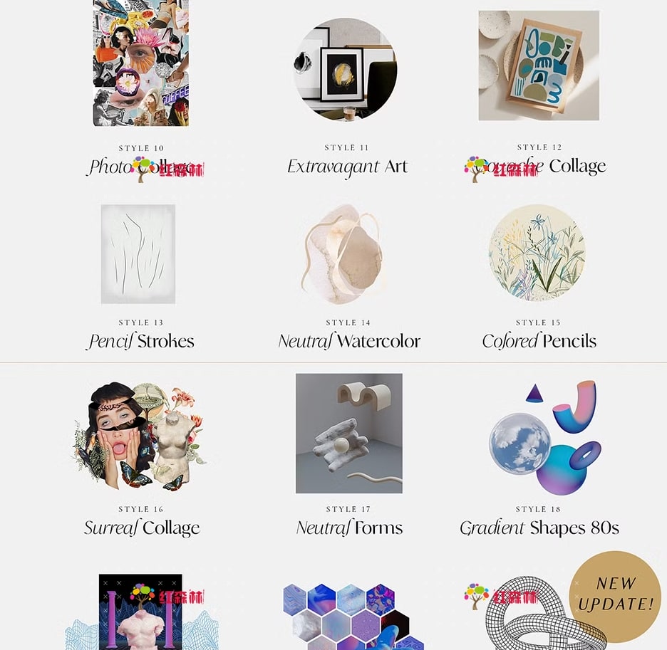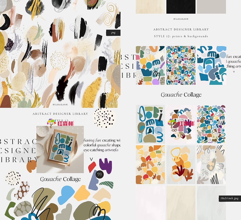 - 12 水粉拼贴画:93 个元素 (.png) + 12 个印刷品/背景 (.jpg)