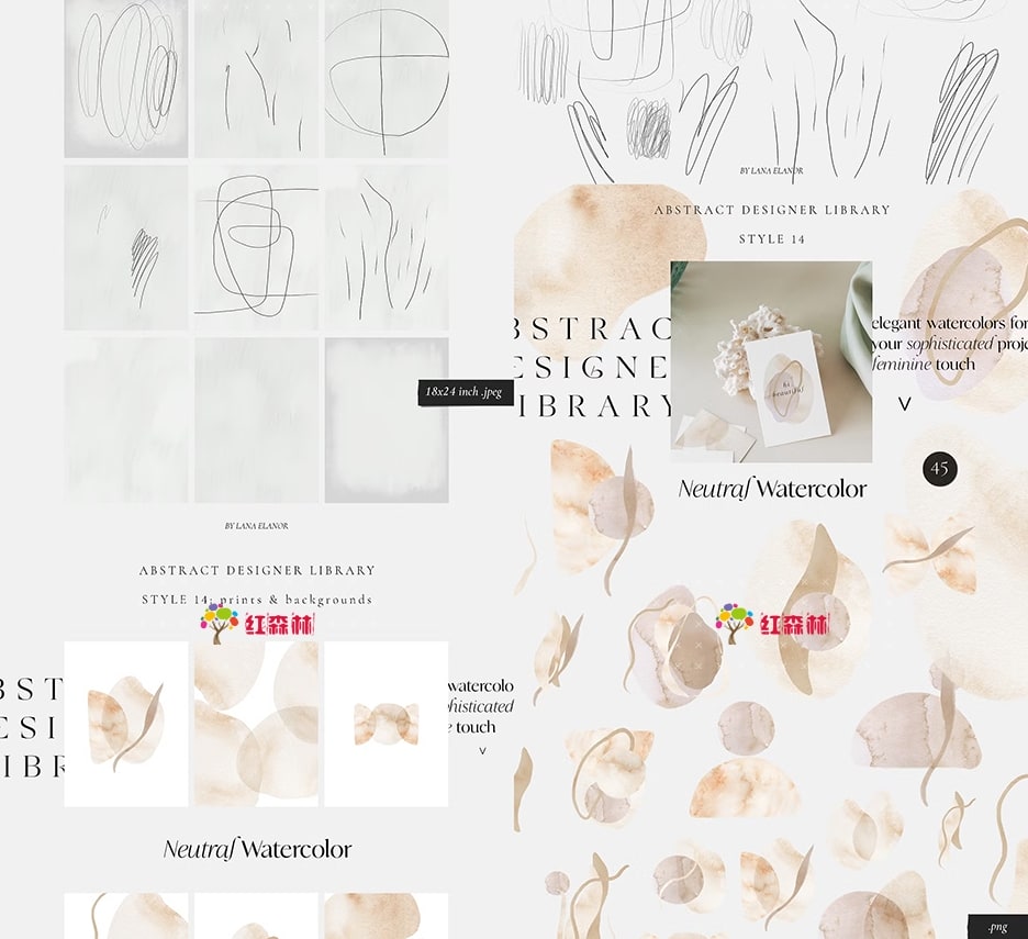 - 14 中性水彩:45 个元素 (.png) + 12 个印刷品/背景 (.jpg)