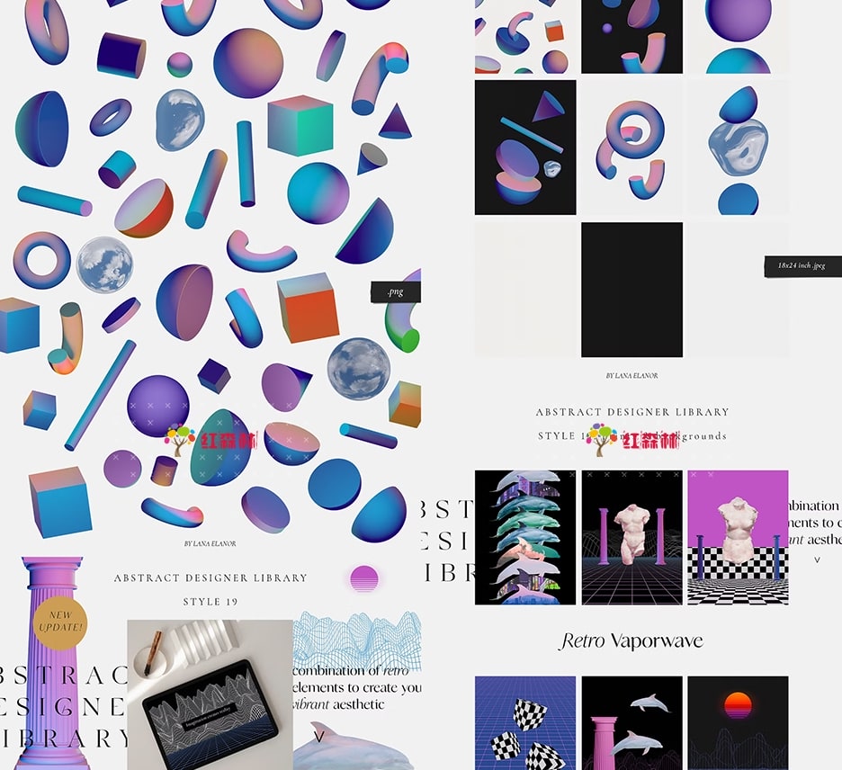 - 18 种 80 年代渐变形状:55 个元素 (.png) + 12 个印刷品/背景 (.jpg)