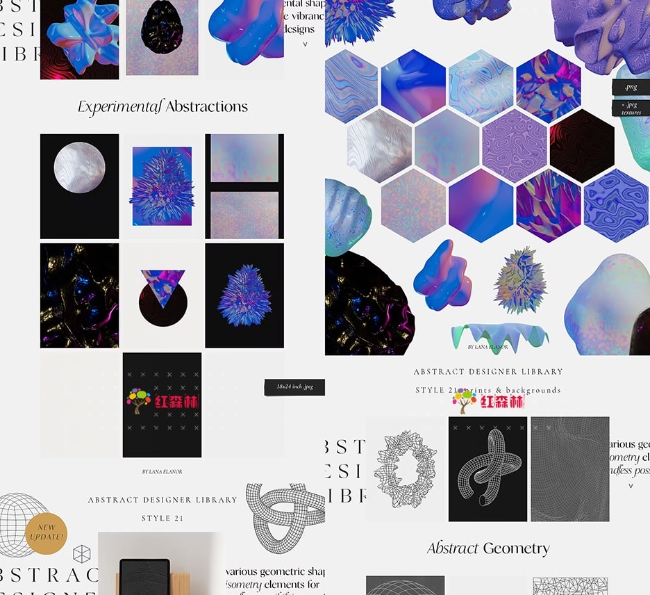 - 20 个实验抽象:29 个元素 (.png) + 12 个印刷品/背景 (.jpg)