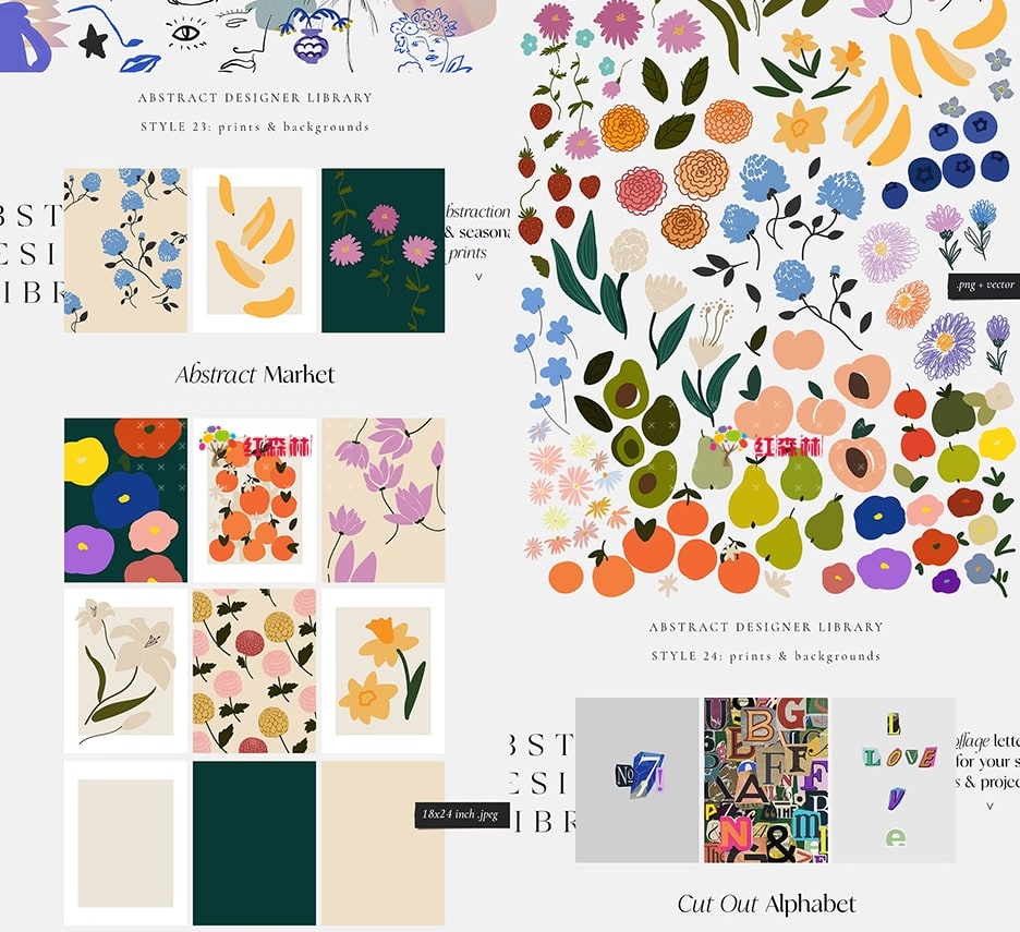 - 23 抽象市场:155 个元素(.png+.ai+.eps)+ 12 个印刷品/背景(.jpg)