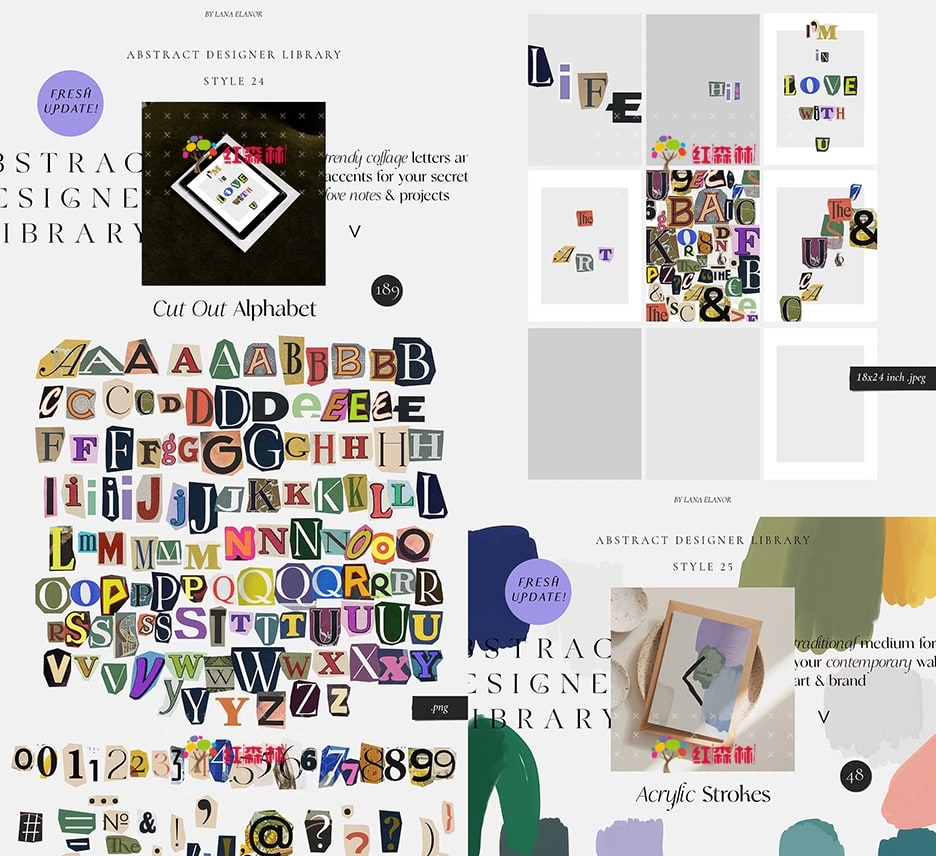 - 24 剪切字母表:189 个元素(.png ~700x800px)+ 12 个打印/背景(.jpg)