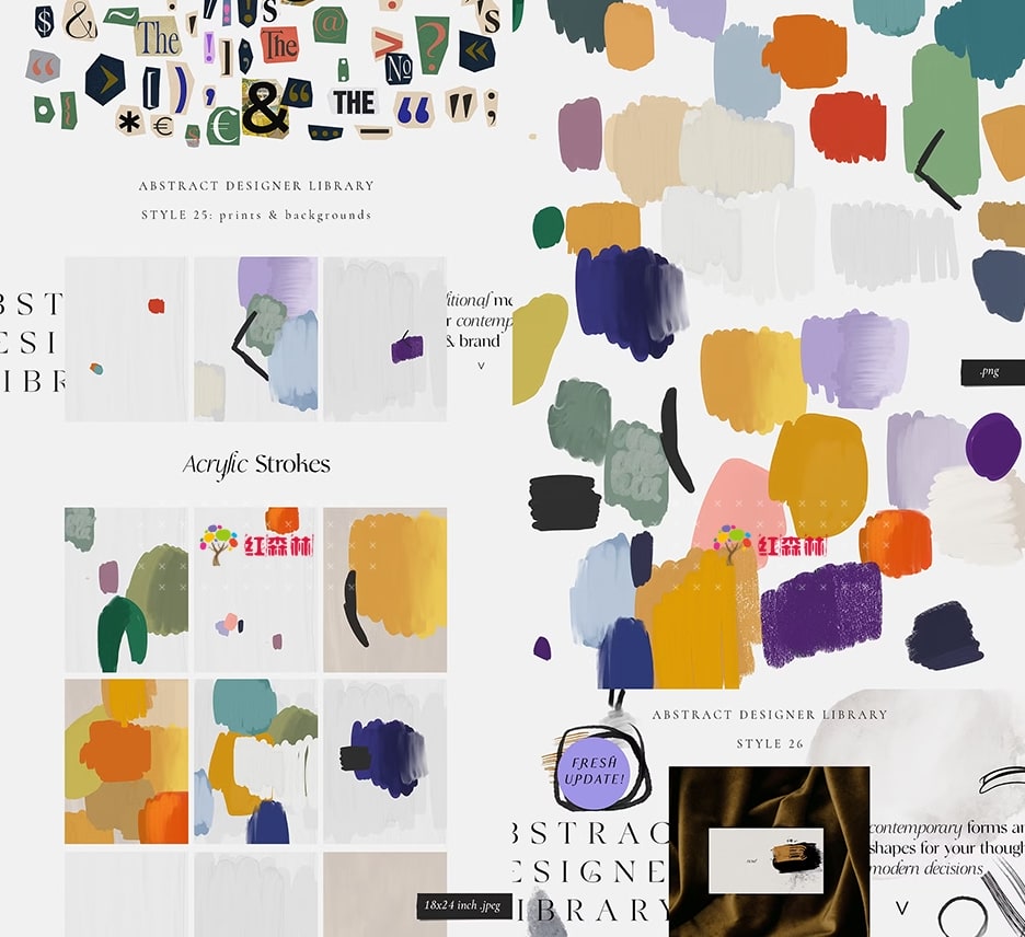 - 25 种丙烯画:48 种元素 (.png) + 12 种印刷品/背景 (.jpg)