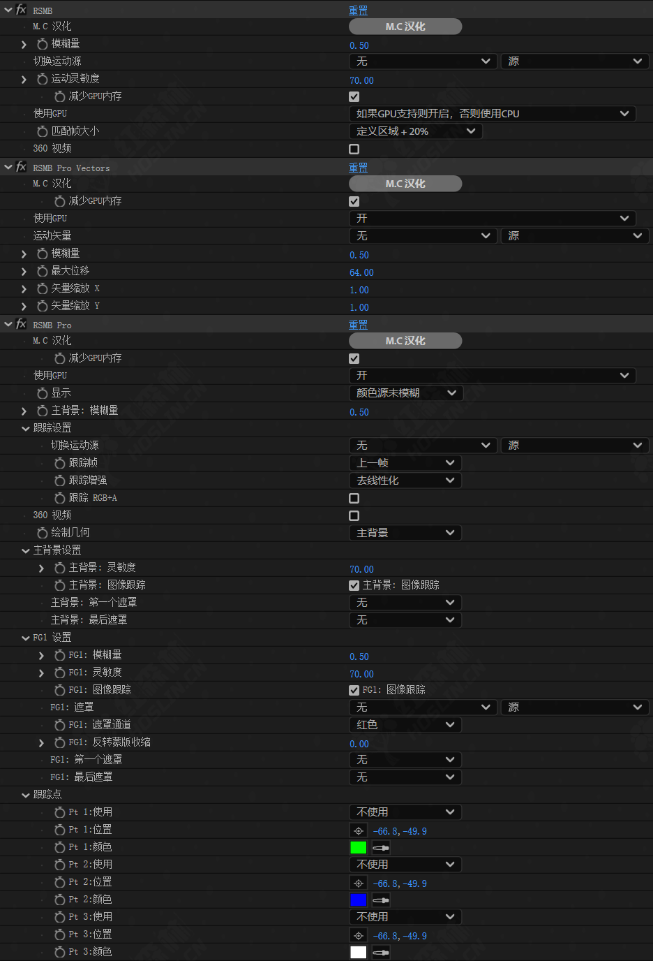 ReelSmart Motion Blur (RSMB) 是一款应用于After Effects和Premiere Pro的动态运动模糊插件,它可以自动添加更多自然的运动模糊效果。跟踪技术的核心在于ReelSmart运动模糊,无需手动设置。当然您可以添加你需要或尽可能多的模糊,甚至消除运动模糊。插件能自动在运动的效果中添加自然真实的运动模糊效果。支持GUP加速渲染;支持多帧渲染。RSMB的算法通过逐像素跟踪分析序列的两个连续帧(从第一帧到下一帧)的运动,并根据运动计算应用模糊。自动检测帧间物体运动的专有跟踪技术使得仅对整个视频的运动部分应用模糊效果成为可能,即使没有诸如遮蔽之类的处理也将成为可能。