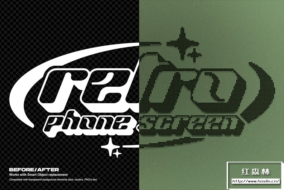 快速轻松地重现 2000 年早期手机屏幕的怀旧外观 – 只需在智能对象层中添加您的设计,即可自动应用效果。此工具可让您只需单击几下即可将清晰的徽标和图像发送回几十年前!所有参数均可编辑以完美适合您的设计。此外,还提供屏幕颜色和叠加选项,以实现多种不同的外观。