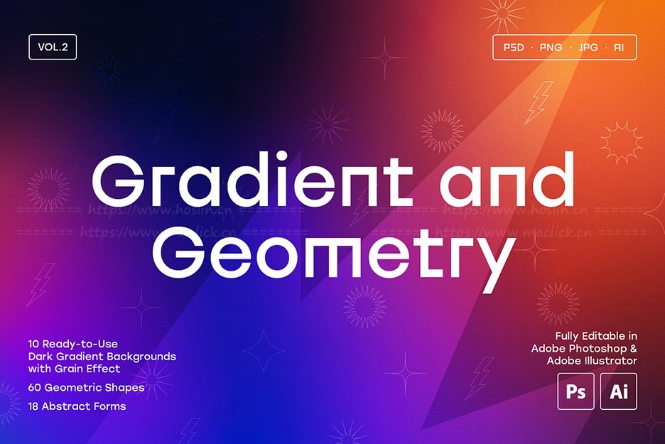 适用于 Adobe Illustrator 和 Adobe Photoshop 的 10 个现成渐变集合。 作为渐变纹理的一个很好的补充,该包包含 18 个抽象形式(Ai、PSD、PNG)和 60 个几何形状,可在 Illustrator 和 Photoshop 中编辑。使用这些精美的图形元素,更快地为您的品牌、产品、网站、社交媒体等设计和构建一些很棒的内容。