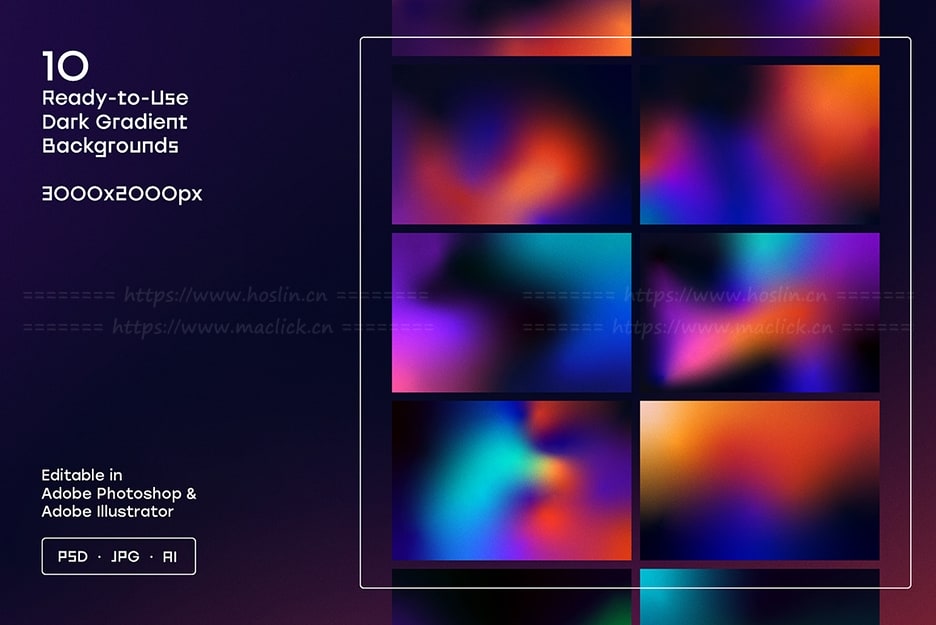 - 10 个渐变背景(AI、PSD、JPG 格式):3000x2000px (横向)