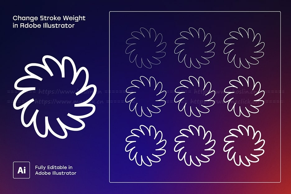 颜色可在 Adobe Illustrator 中自定义。 噪声效果可在 Photoshop 文件中根据需要进行编辑(颗粒纹理包含在单独的图层中)。