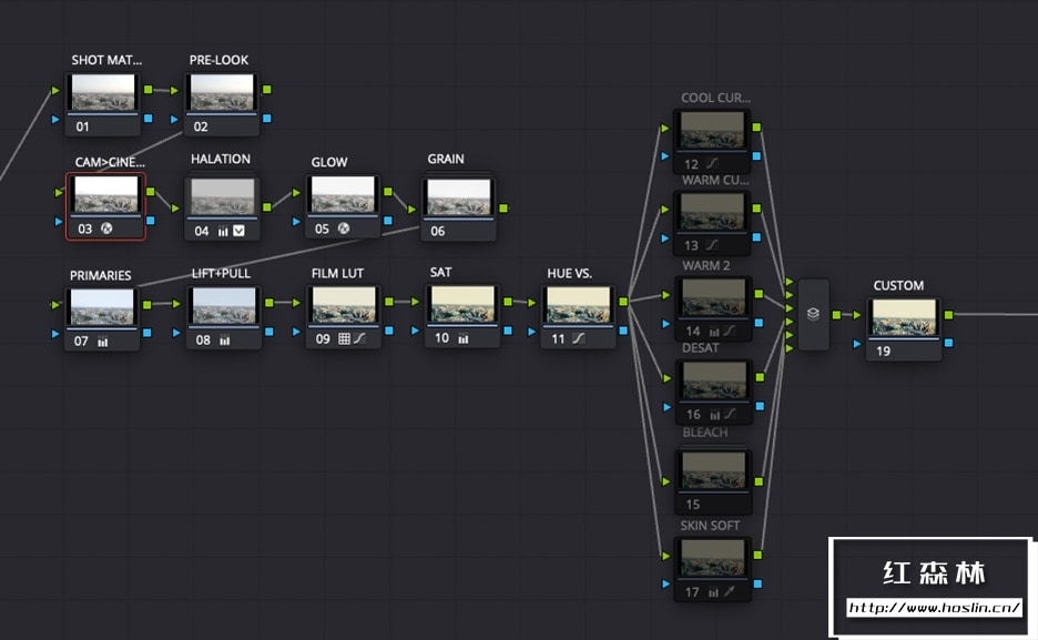 这款 16MM Power Grade 结合了多种先进的胶片模拟技术。从内置伽马转换以正确模拟胶片光晕,到细微的曝光/对比度修改以使数字素材感觉更像模拟,您不会找到具有如此多特色的胶片模拟 Power Grade。我们首先按流程顺序放置镜头匹配节点,以帮助在应用修改之前匹配您的素材。然后是“PRE-LOOK”节点,我们使用该节点将初始平衡应用于图像并进行基本校正,因为如果最初没有正确平衡,某些细节可能会丢失,因此某些校正可能无法在链条的后续阶段进行。