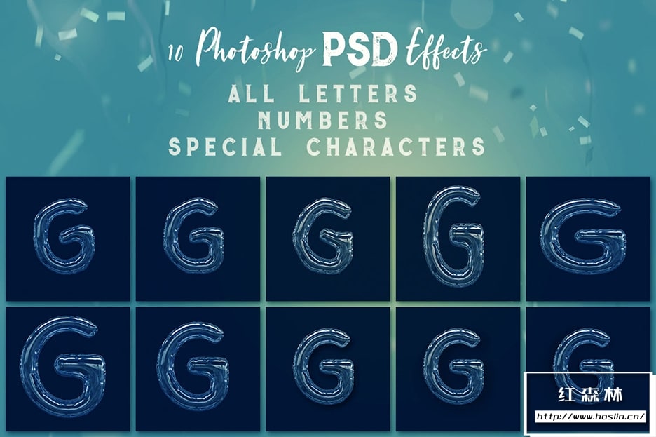 - 分层的 Photoshop PSD 文件,包含 10 种字母效果 – 带有智能对象