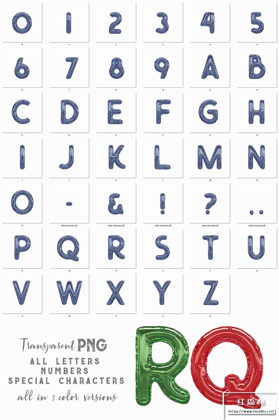 高分辨率 3D 铝箔气球字母渲染(3000×3000 – 但字母大小约为 1500×2000)。非常适合您的标题、海报、广告 – 任何网络或印刷项目。您还可以在这里找到具有 10 种效果(阴影、效果……)的分层 PSD 文件 – 只需在智能对象中替换字母,您就会看到所有 10 种效果的字母。