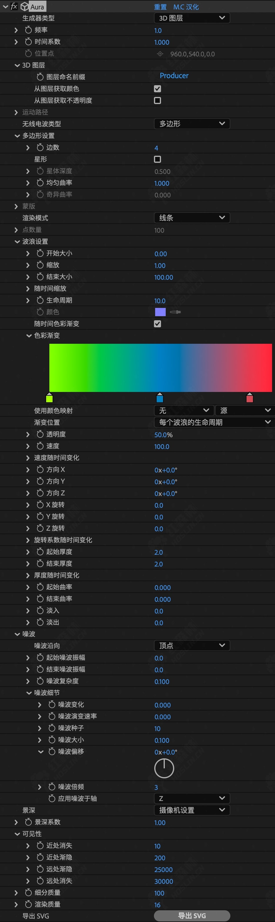 Aura 现在支持多帧渲染 (MFR) 和 SVG 导出!Aura 作为 After Effects 的程序插件,可在 3D 空间中创建优雅的几何形状。它类似于粒子系统,但不是在整个地方渲染小粒子,而是像经典的 Radiowaves 插件一样生成随时间变化的矢量形状(波)。它可以毫不费力地渲染数十万个高频波,并创建令人着迷的动画。