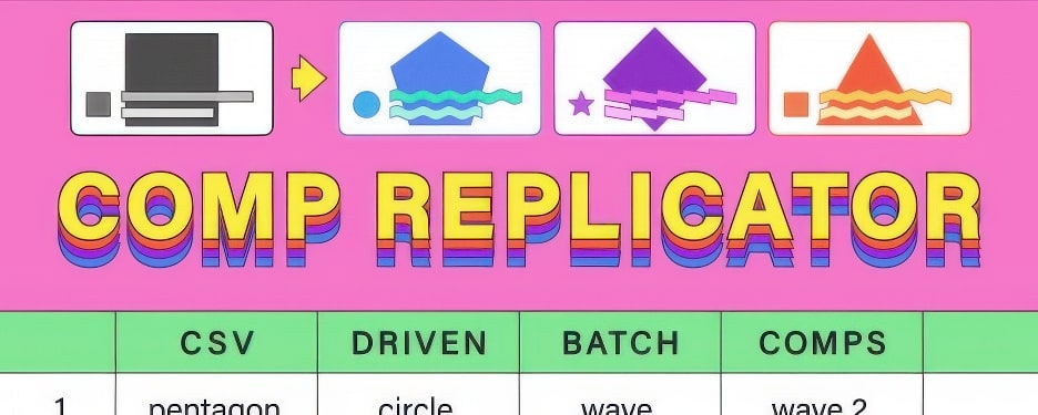 Comp Replicator 脚本可用于帮助用户在 Adobe After Effects 中通过 CSV 文件批量创建和自定义合成(Compositions)。该脚本简化了从单个模板组合生成多个版本的图形或动画的过程,每个版本都使用电子表格中的不同内容进行定制。使用 Comp Replicator 转变您的视频制作工作流程,它是利用电子表格的强大功能轻松复制和自定义 Adob​​e After Effects 合成的终极工具。无论您是制作精美的标题、在世界范围内本地化副本还是自动化视频序列,此脚本都可以让初学者或专业人士顺利、快速、轻松地将电子表格转换为合成文件。