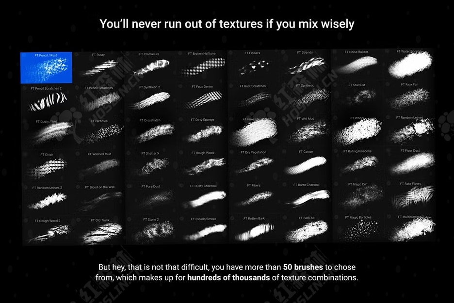 此套装与任何艺术风格完美搭配。您可以将 Texturizer Pro 与已有的任何其他画笔套装结合使用,如果您觉得您的作品看起来太干净,并想赋予它更前卫的感觉,它就是您的最佳伴侣。