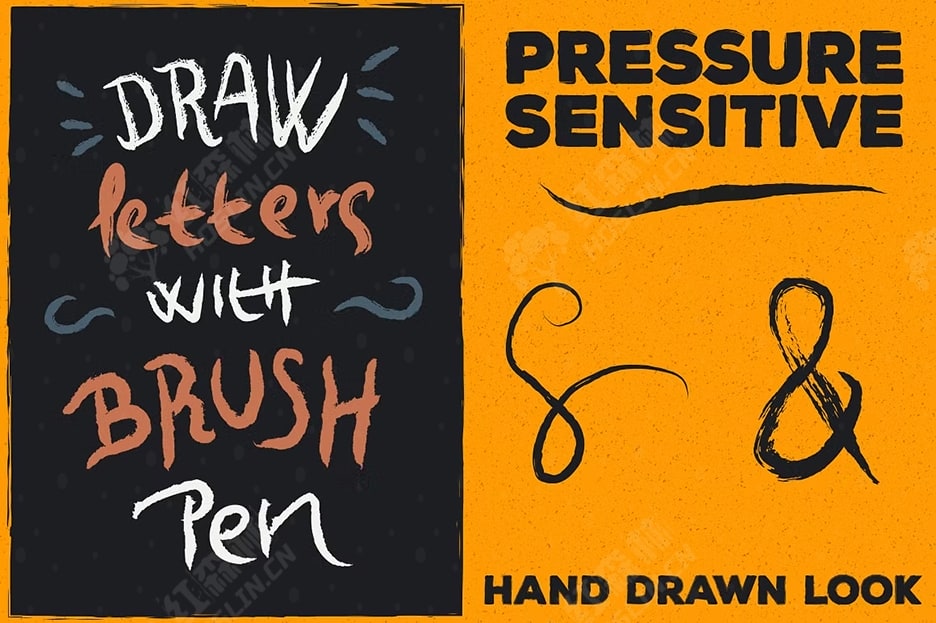 受毛笔字体的启发,我为您的矢量作品制作了各种各样的画笔。现在,您不再仅限于在纸上使用毛笔!拿起您的手写板,在下一个项目中尝试一下吧!这款方便的画笔包里有各种不同尺寸、按压灵敏度和纹理的画笔。您可以绘制漂亮的手绘插图,也可以将其用于书写。