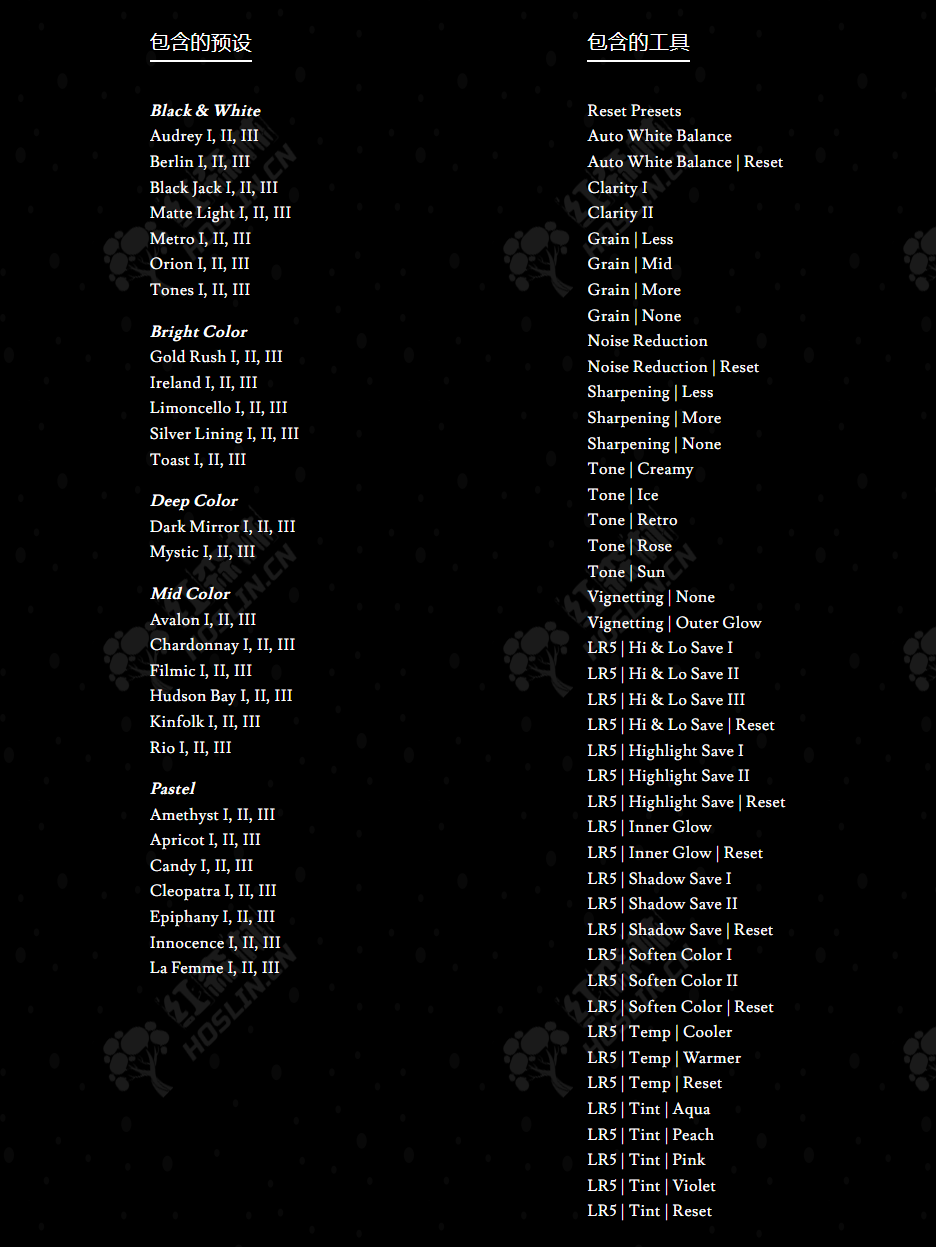 Pro Set III 包含 125 个预设:60 个彩色预设、21 个黑白预设和 44 个工具。