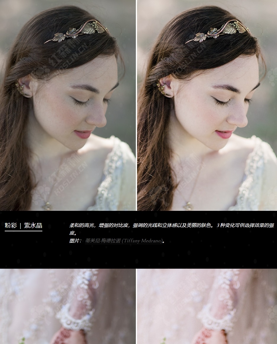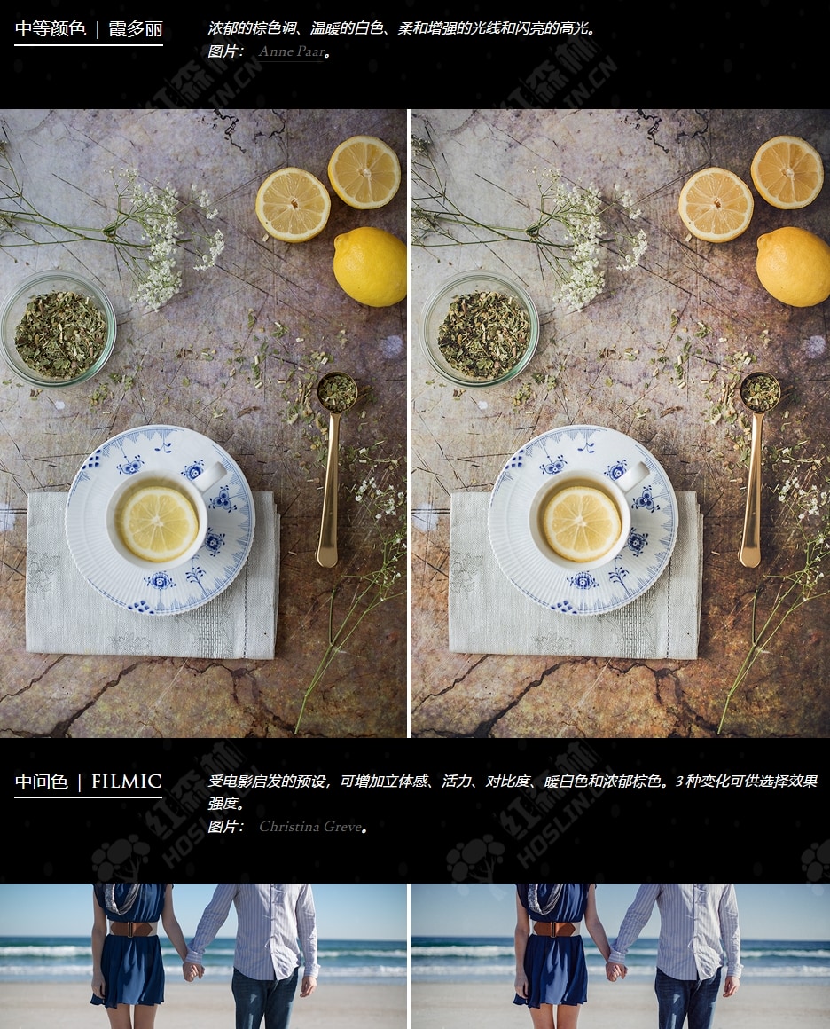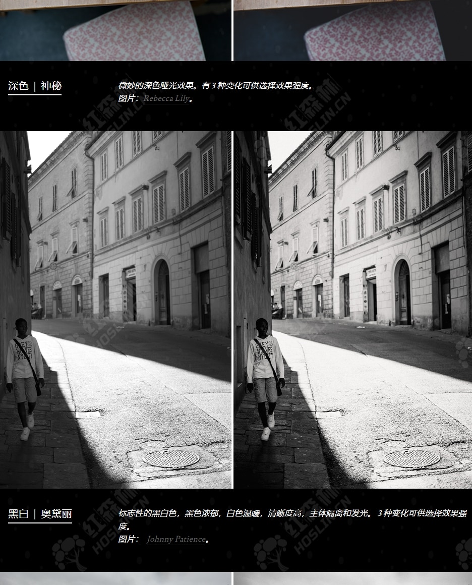 这些预设提供了多种色彩效果,适合各种场合和风格,从奶油色复古色调到柔和色调,还有全新的黑白色调。我们精心设计了效果,让效果本身看起来自然而微妙。整个设置中,肤色都经过了特殊的美容处理,保持了色彩和亮度的平衡,高光更加轻盈、通透和细腻。先进的新技术为您的照片提供了更多的维度和视觉趣味,强调光线、提供纹理并保留最大细节。