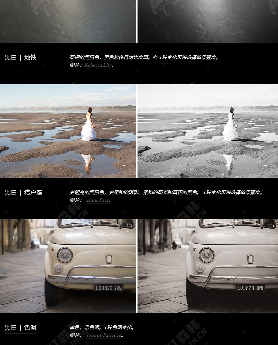 Pro Set III 中的预设按效果进行组织:黑白、亮色、深色、中间色和柔和色,因此可以轻松找到适合会话的预设。该套装包含 27 个预设,每个预设有 3 个版本。版本 I 是基础版本,版本 II 和 III 逐步增强效果。这让您能够选择每幅图像的效果级别。例外情况是色调和 Kinfolk 预设,它们在三个版本中提供颜色变化。
