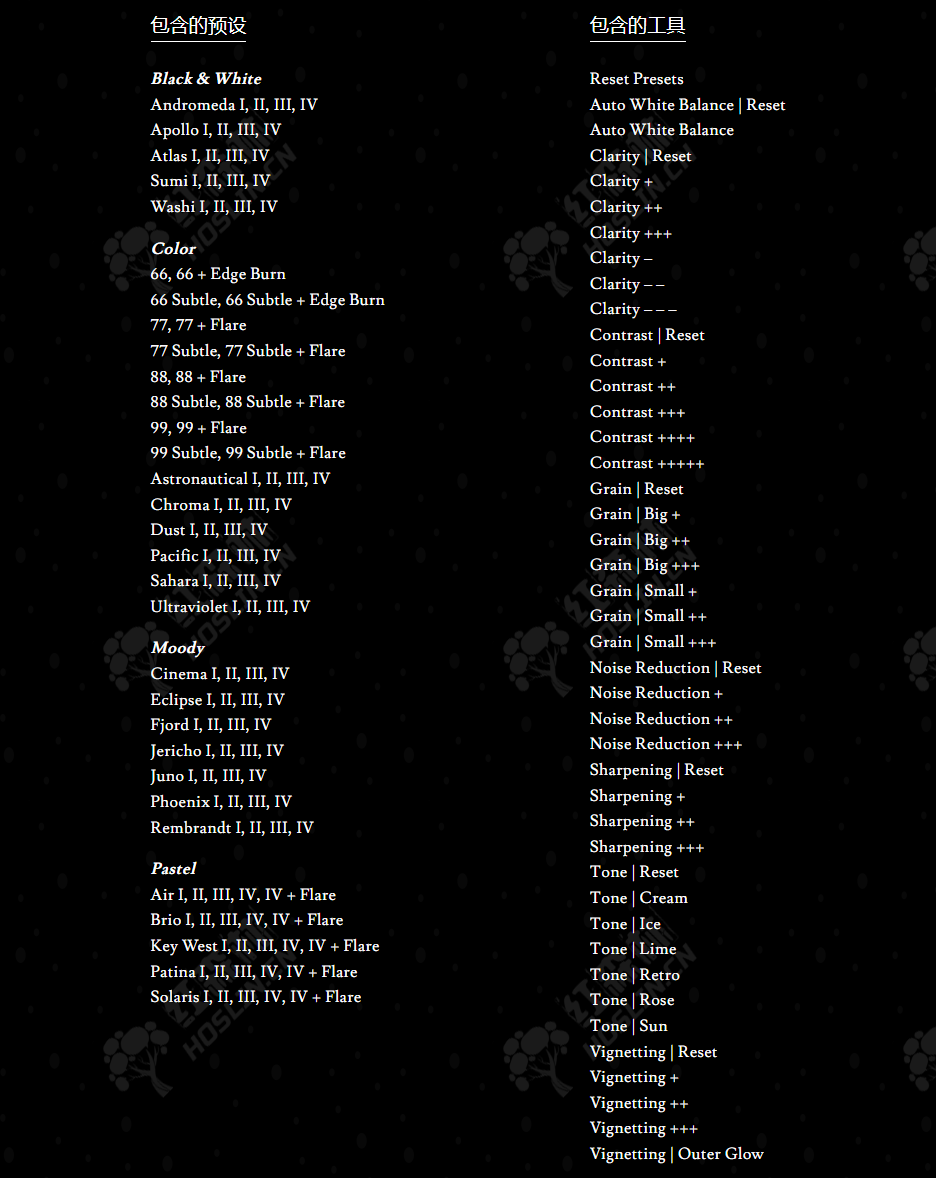 Pro Set V 包含 156 个预设:93 个彩色、20 个黑白和 43 个工具。