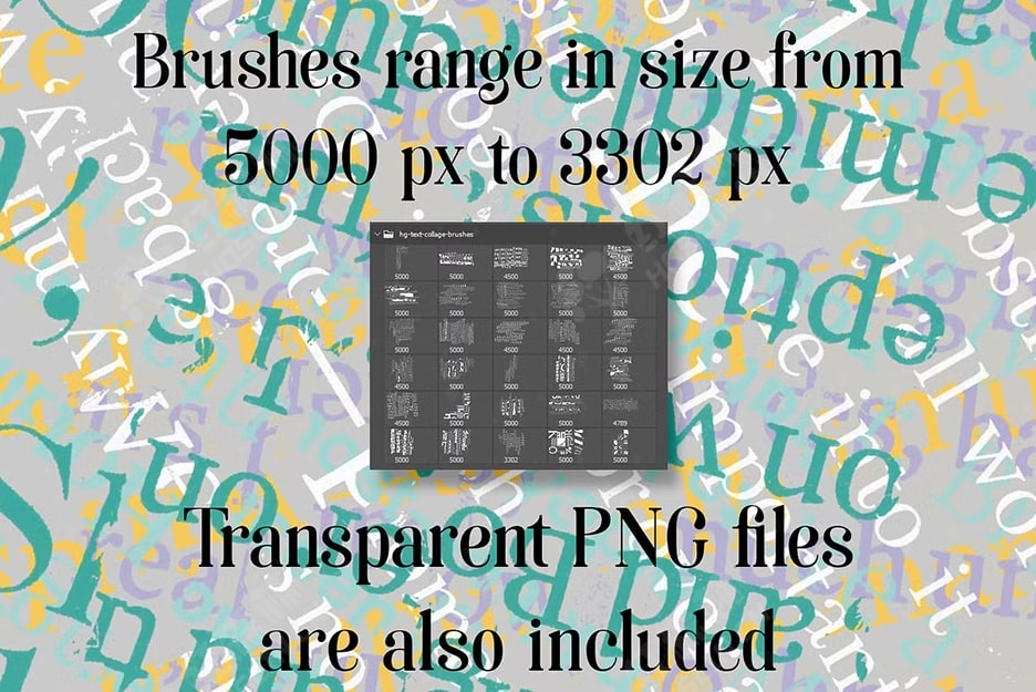 这是一组 30 种不同的文本拼贴 Photoshop 笔刷。笔刷采用 Photoshop .abr 格式,大小范围从 5000 像素到 3302 像素。