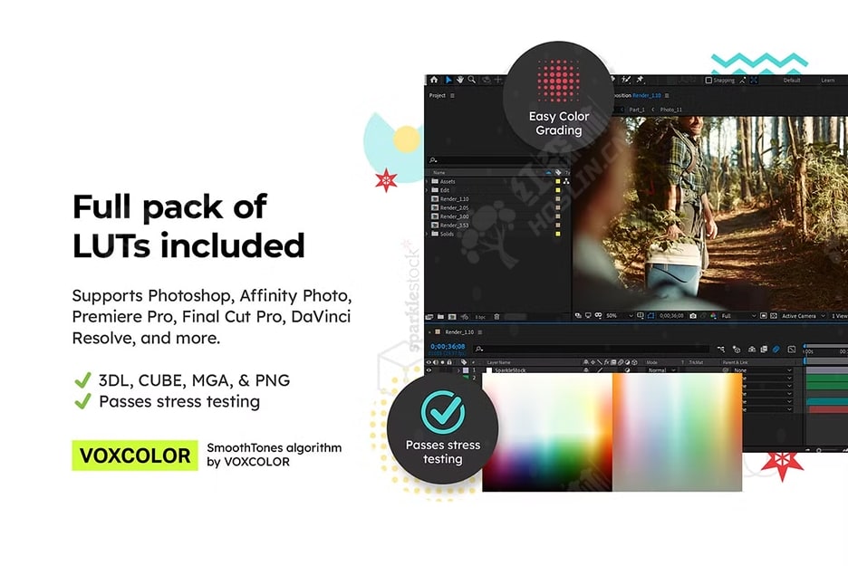 - SparkleStock LUT与 Photoshop CC、Capture One Pro(通过 ICC 配置文件)、Affinity Photo、Darktable、Premiere Pro 22.0+、Final Cut Pro v10.4+、DaVinci Resolve、CapCut、Avid Media Composer、Cyberlink ColorDirector、OBS Studio、Vegas Pro、Spark AR Studio、Nuke、Filmora 兼容