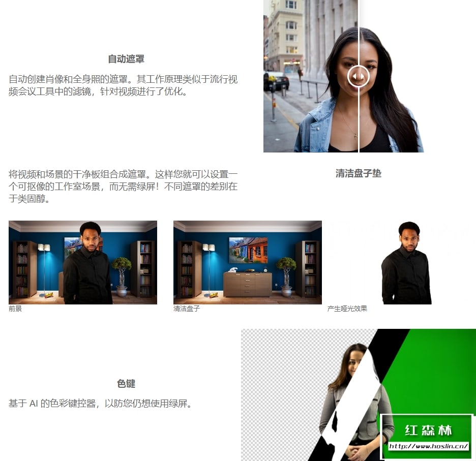 • 颜色键控。基于 AI 的颜色键控器,以防您仍想使用绿屏。