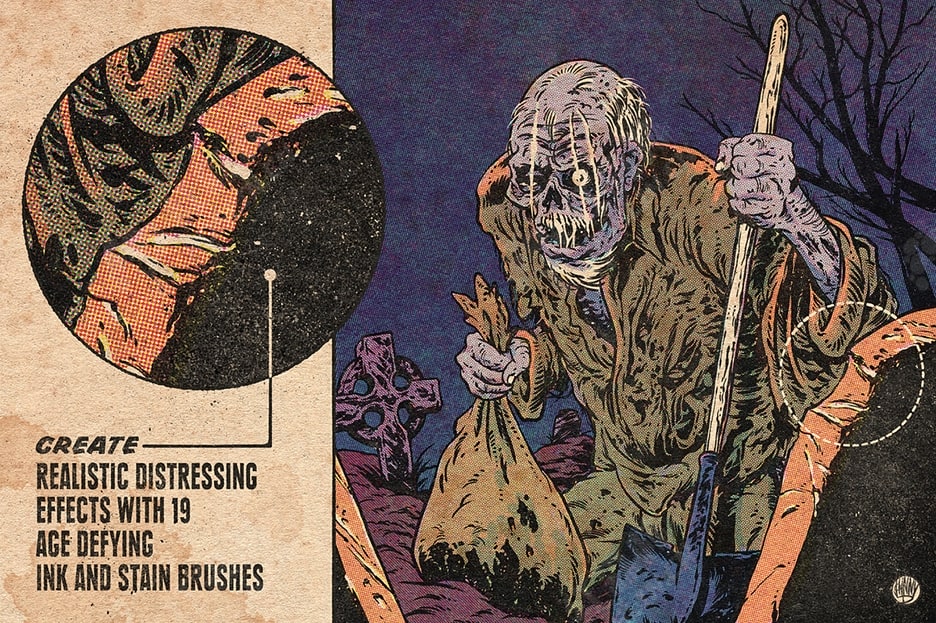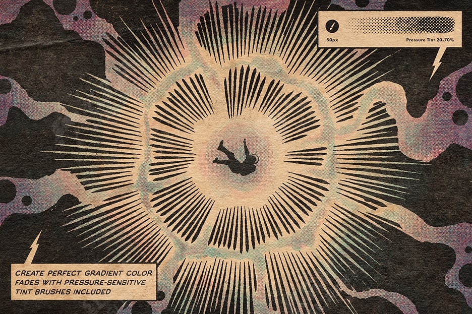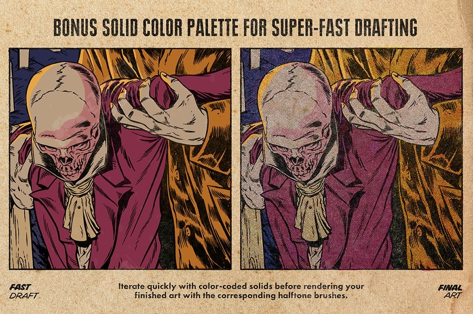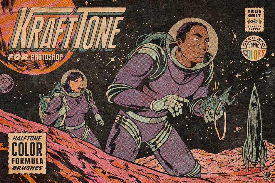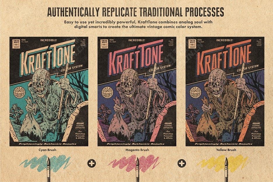 忠实再现老式漫画书印刷的温暖、怀旧美感,效果如此真实,您会发誓您正在看的是扫描件。KraftTone 色彩系统提供 370 多种颜色,功能强大,可真实再现早已被遗忘的模拟工艺,工艺精湛,操作简便。KraftTone 的设计充分考虑了生产效率和多功能性,采用易于使用的基于画笔的工艺,允许对每一步进行完全自定义。
