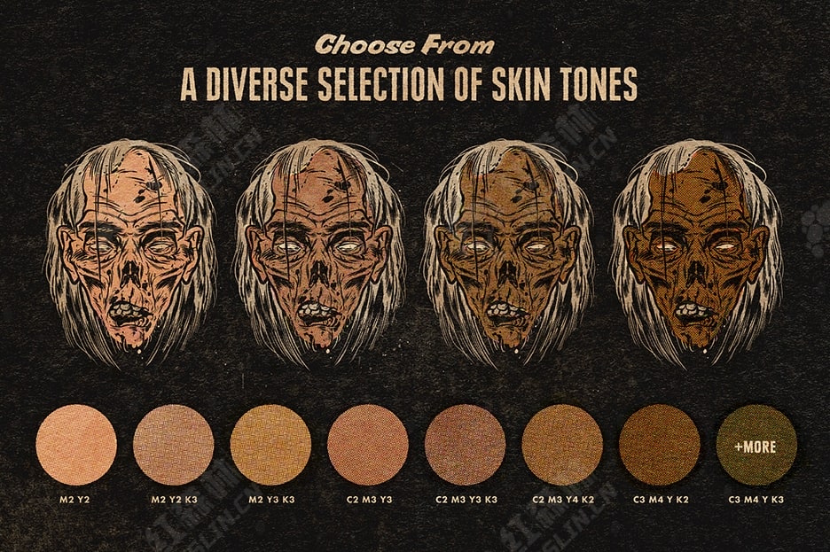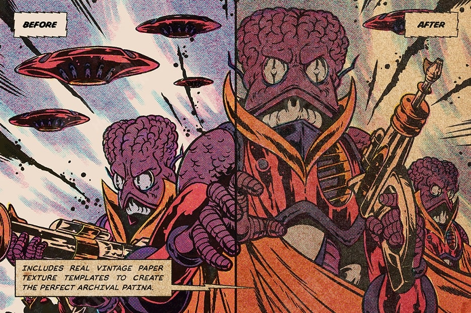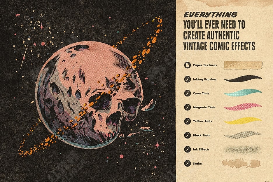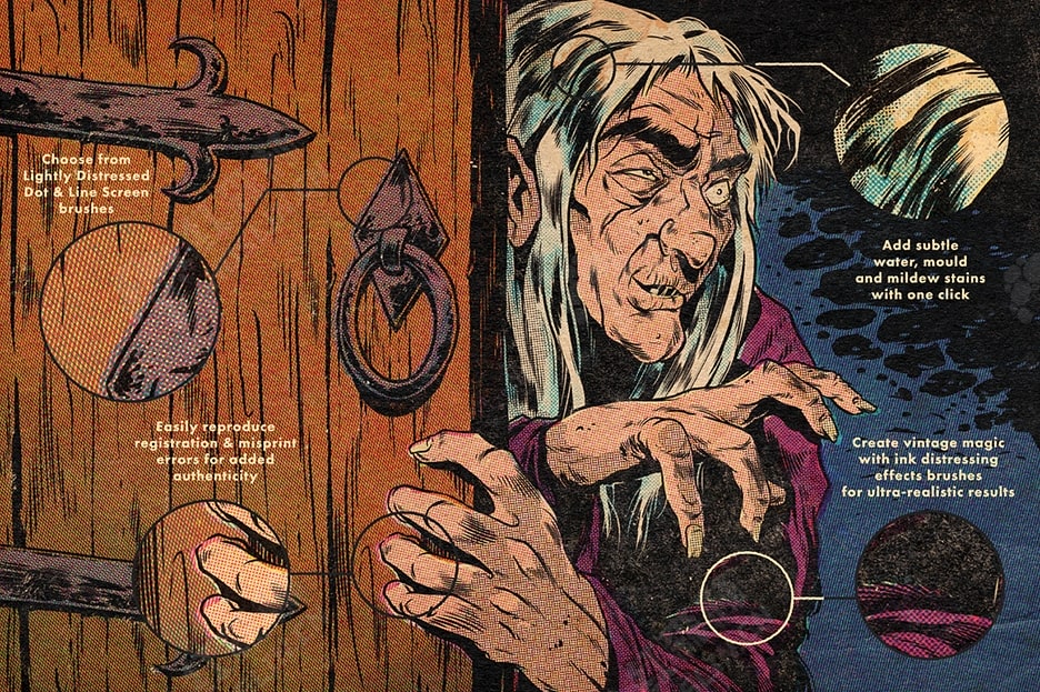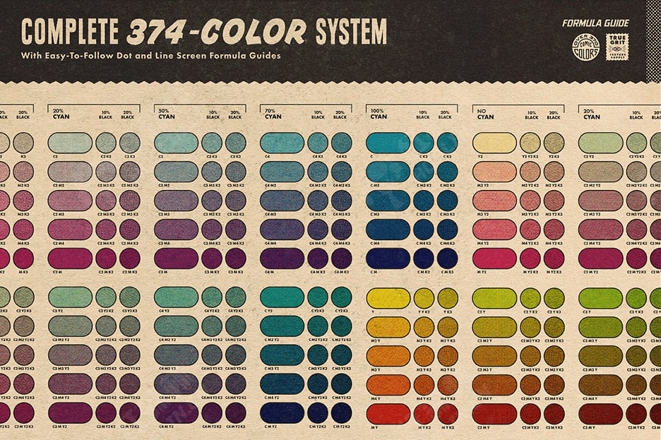 - 374 种颜色可选,采用轻微磨损的点和线网色调。完全控制流程,从油墨和纸张纹理到磨损效果和套准错误。