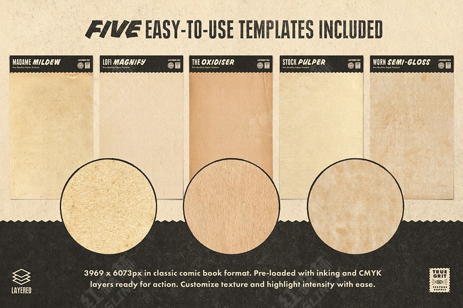 - 5 x 经典漫画书格式的纸质纹理模板(6 5/8“ x 10 1/8”)。