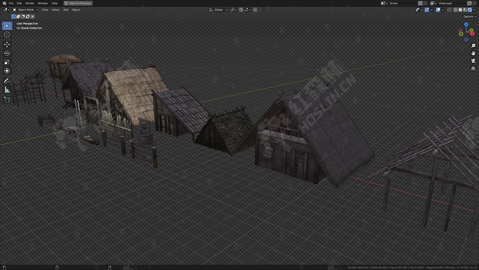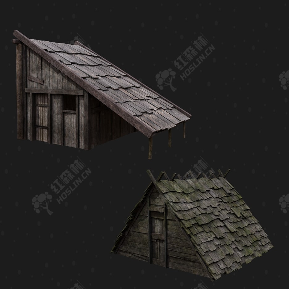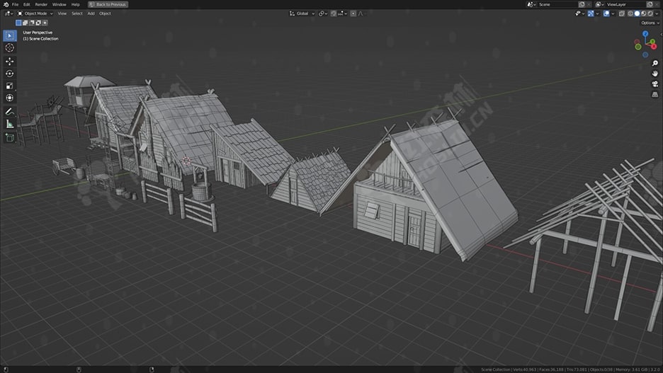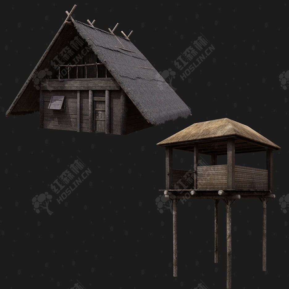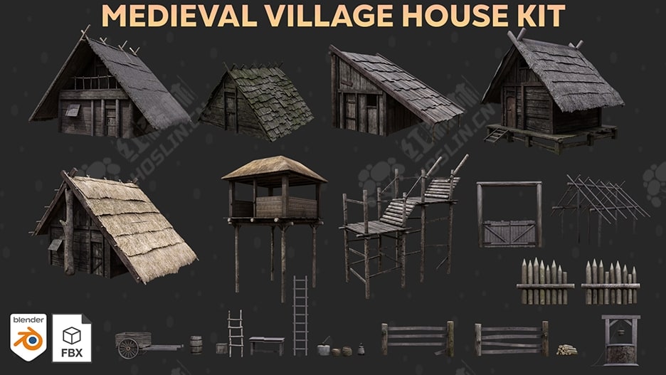 Medieval Village Kitbash 包含木制村庄结构共36200个面片,26个模型结构及道具。