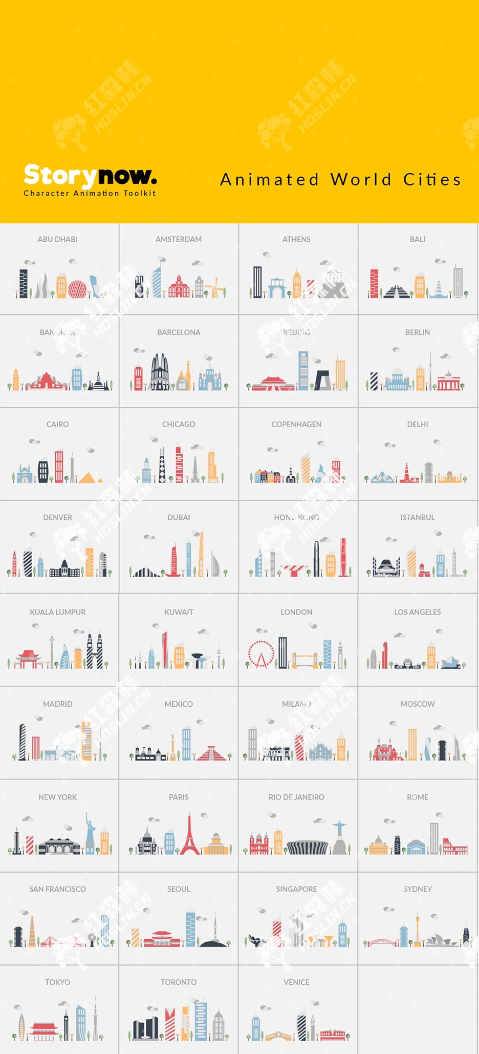 35 个动画世界城市:阿布扎比、阿姆斯特丹、雅典、巴厘岛、曼谷、巴塞罗那、北京、柏林、开罗、芝加哥、哥本哈根、德里、丹佛、迪拜香港、伊斯坦布尔、吉隆坡、科威特、伦敦、洛杉矶、马德里、墨西哥、米兰、莫斯科、纽约、巴黎、里约热内卢、罗马、旧金山、汉城、新加坡、悉尼、东京、多伦多、威尼斯
