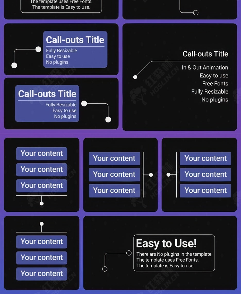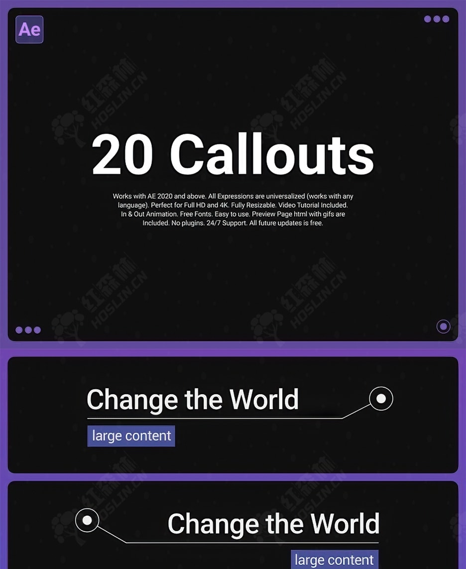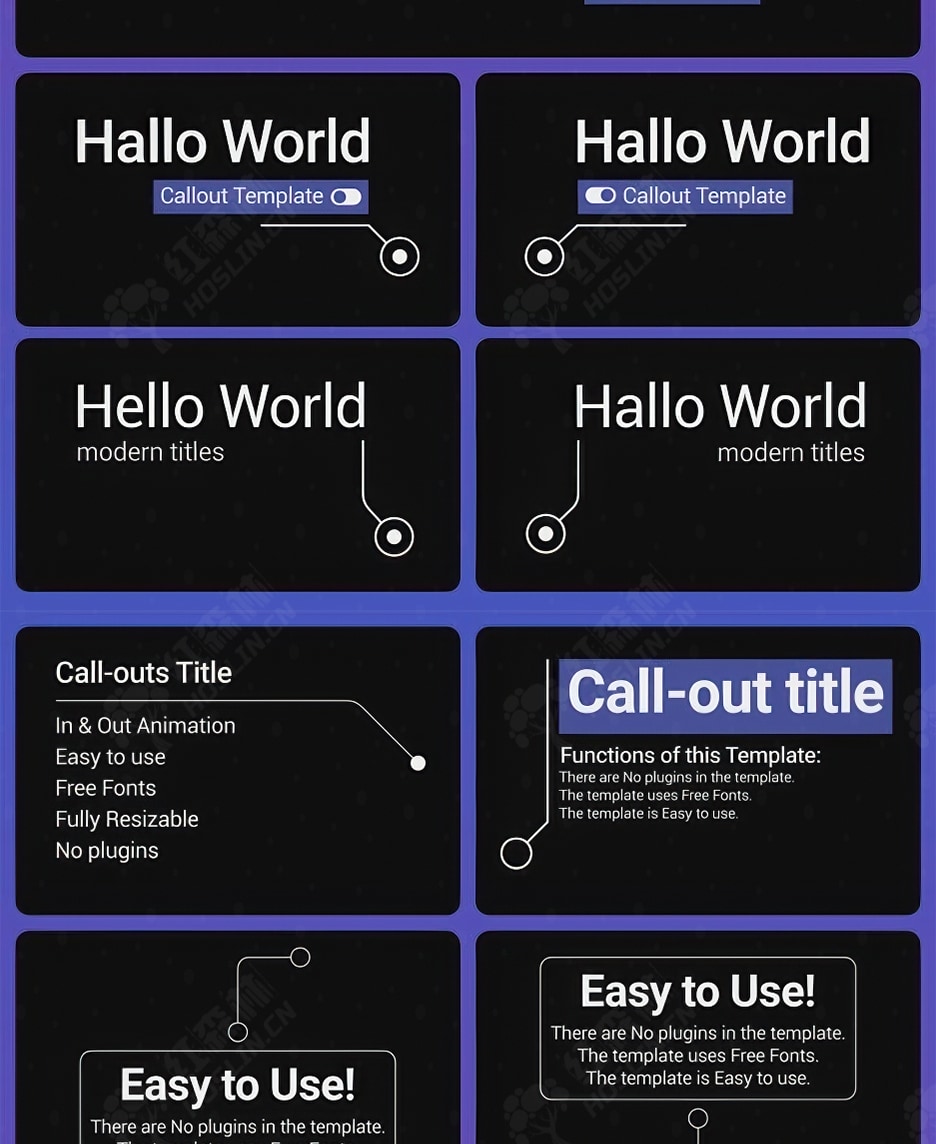 使用模板 Call-outs Infographics 可添加指示性文字或图形标注到视频中。标注标题、标注包、HUD 和 UI 信息图表等元素动画,完美适配全高清和4K,完全可调整大小。包含进出动画,包含带有 gif 的预览页面html和视频教程。非常适合用来强调视频中的特定元素或信息,比如产品介绍、教程视频、数据展示等。