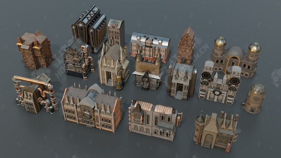 15个建筑Kitbash模型可以用于快速创建蒸汽朋克风格的建筑。可能包括齿轮、管道、阀门等额外的细节配件,用于装饰和完善模型。FBX格式,您可以在任何 3d 软件中使用这些模型并创建自己的设计 :) 包含材质贴图。文件大小:839M