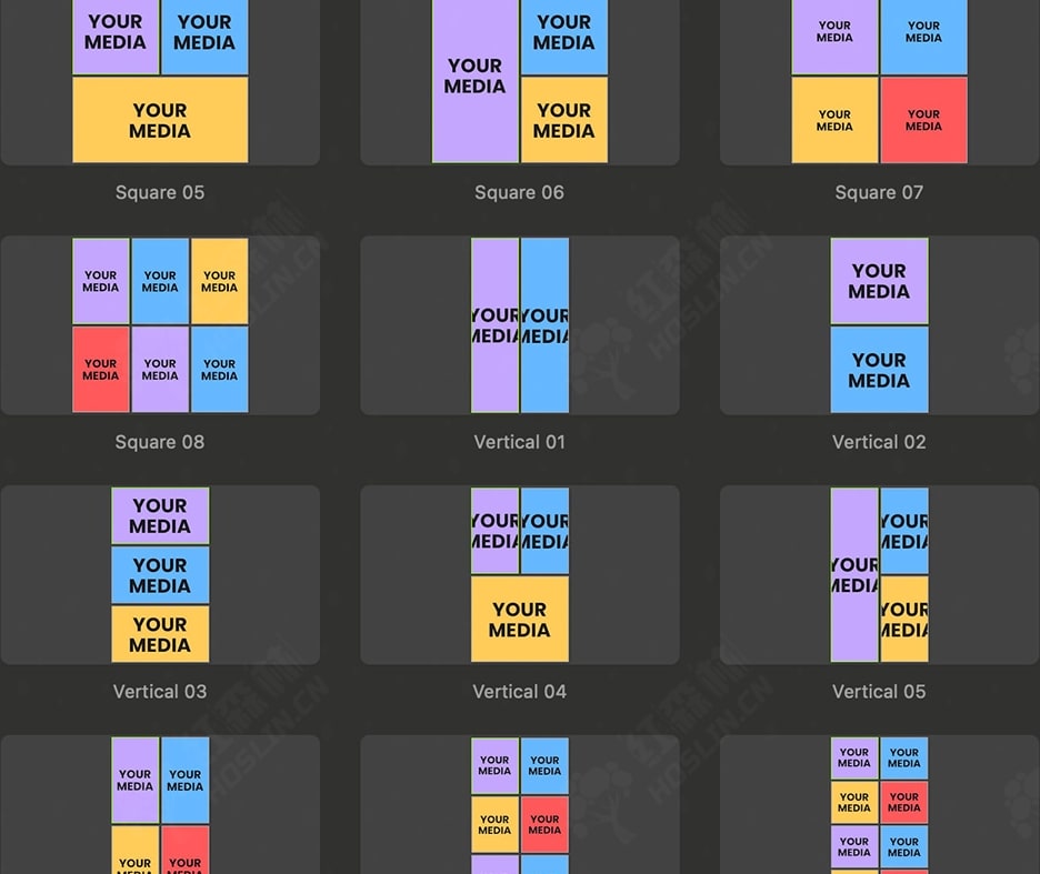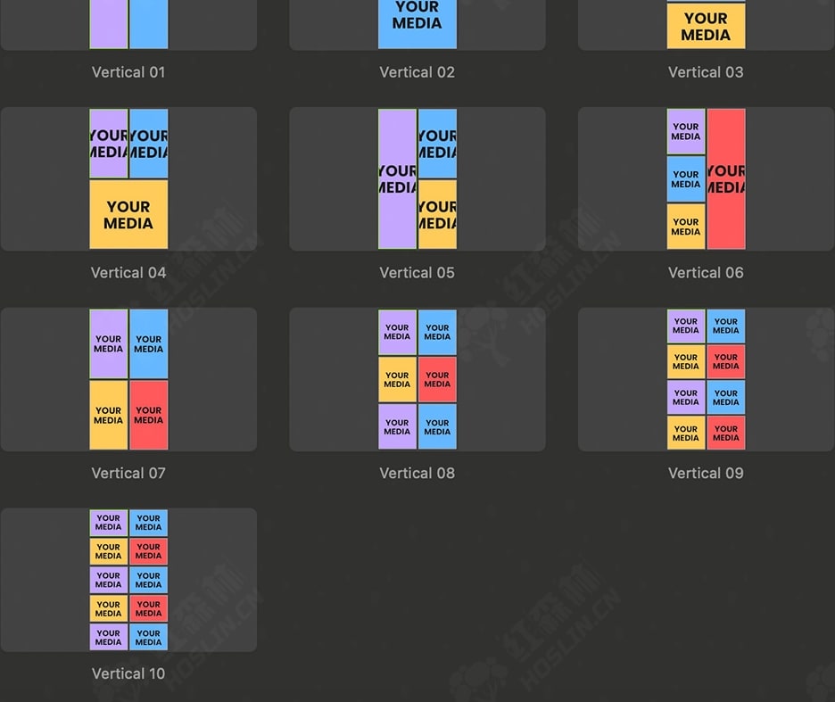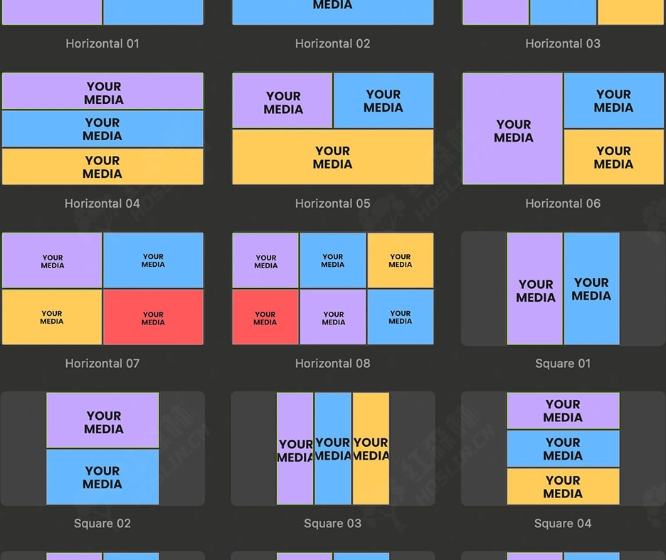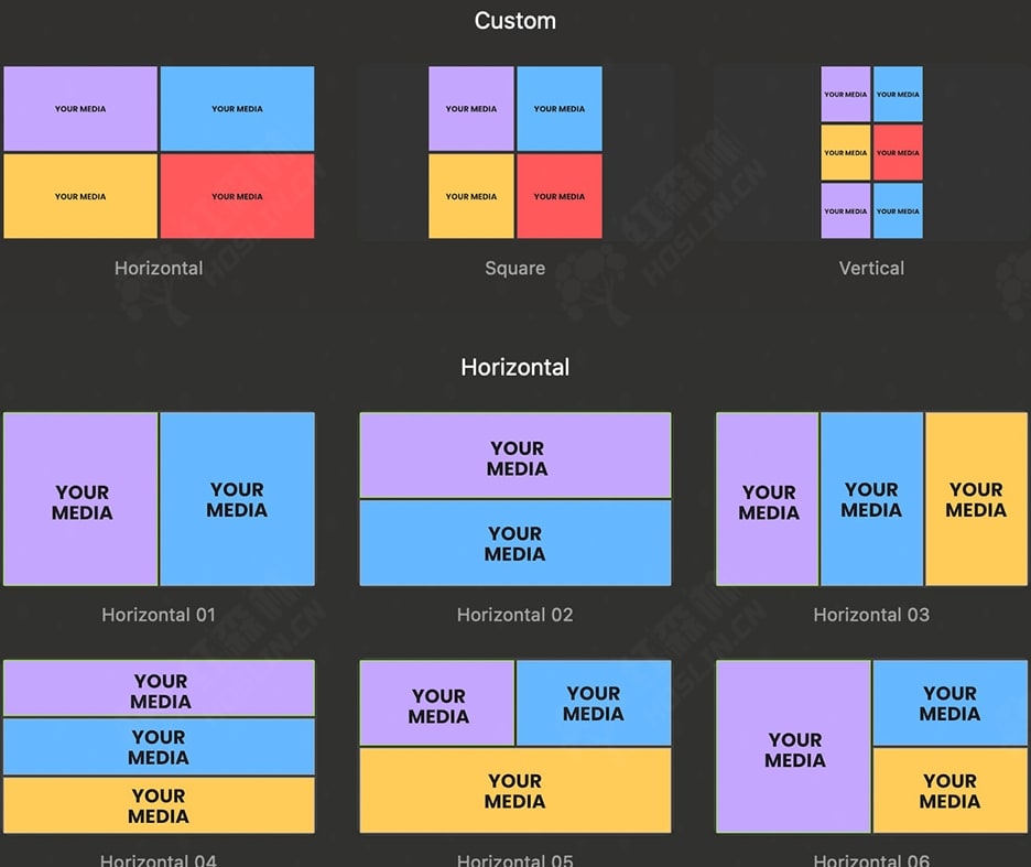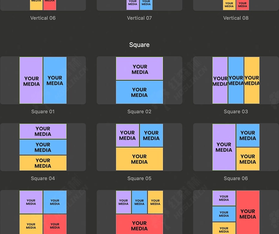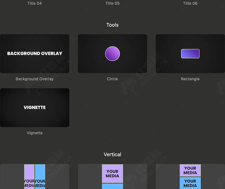 Multiclips 支持横版、方屏和竖版画幅,可以通过调整背景叠加,可以实现不同的视觉效果,如纯色、裁剪、模糊、着色、黑白等。附加提供额外的标题、20个动画图标和附加合成工具,如背景叠加和晕影效果。